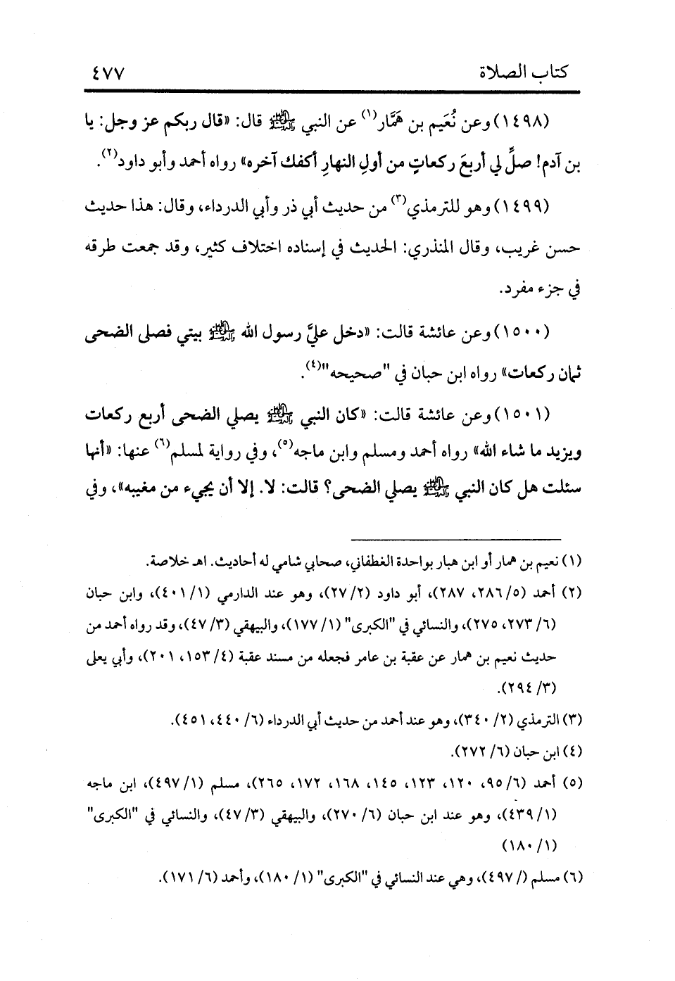 1498 - وعن نُعَيم بن هَمَّار (¬1) عن النبي - صلى الله عليه وسلم - قال: «قال ربكم عز وجل: يا بن آدم! صلِّ لي أربعَ ركعاتٍ من أولِ النهارِ أكفك آخره» رواه أحمد وأبو داود (¬2) .