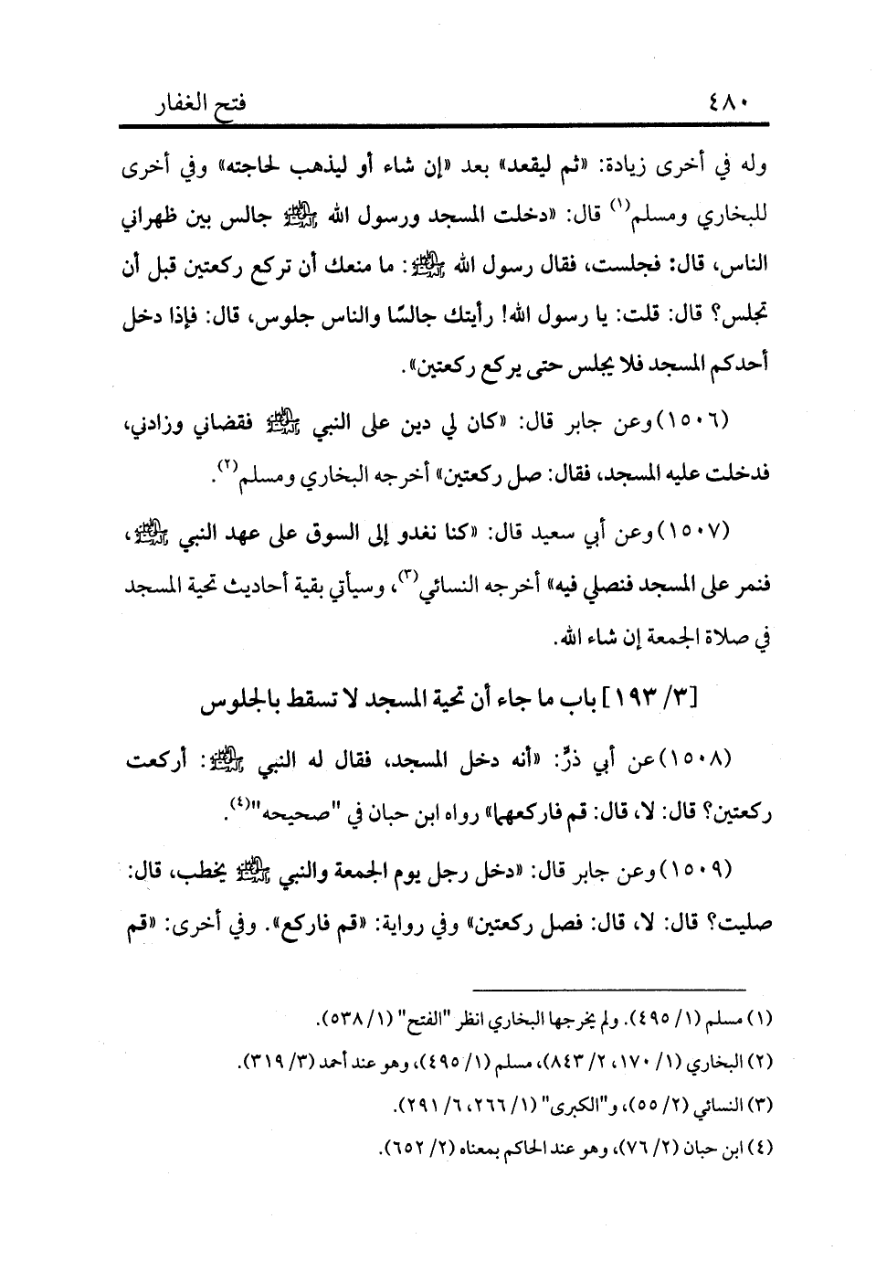 1507 - وعن أبي سعيد قال: «كنا نغدو إلى السوق على عهد النبي - صلى الله عليه وسلم -، فنمر على المسجد فنصلي فيه» أخرجه النسائي (¬3) ، وسيأتي بقية أحاديث تحية المسجد في صلاة الجمعة إن شاء الله.