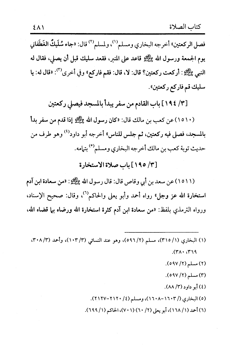 1510 - عن كعب بن مالك قال: «كان رسول الله - صلى الله عليه وسلم - إذا قدم من سفر بدأ بالمسجد، فصلى فيه ركعتين، ثم جلس للناس» أخرجه أبو داود (¬4) وهو طرف من حديث توبة كعب بن مالك أخرجه البخاري ومسلم (¬5) بتمامه.