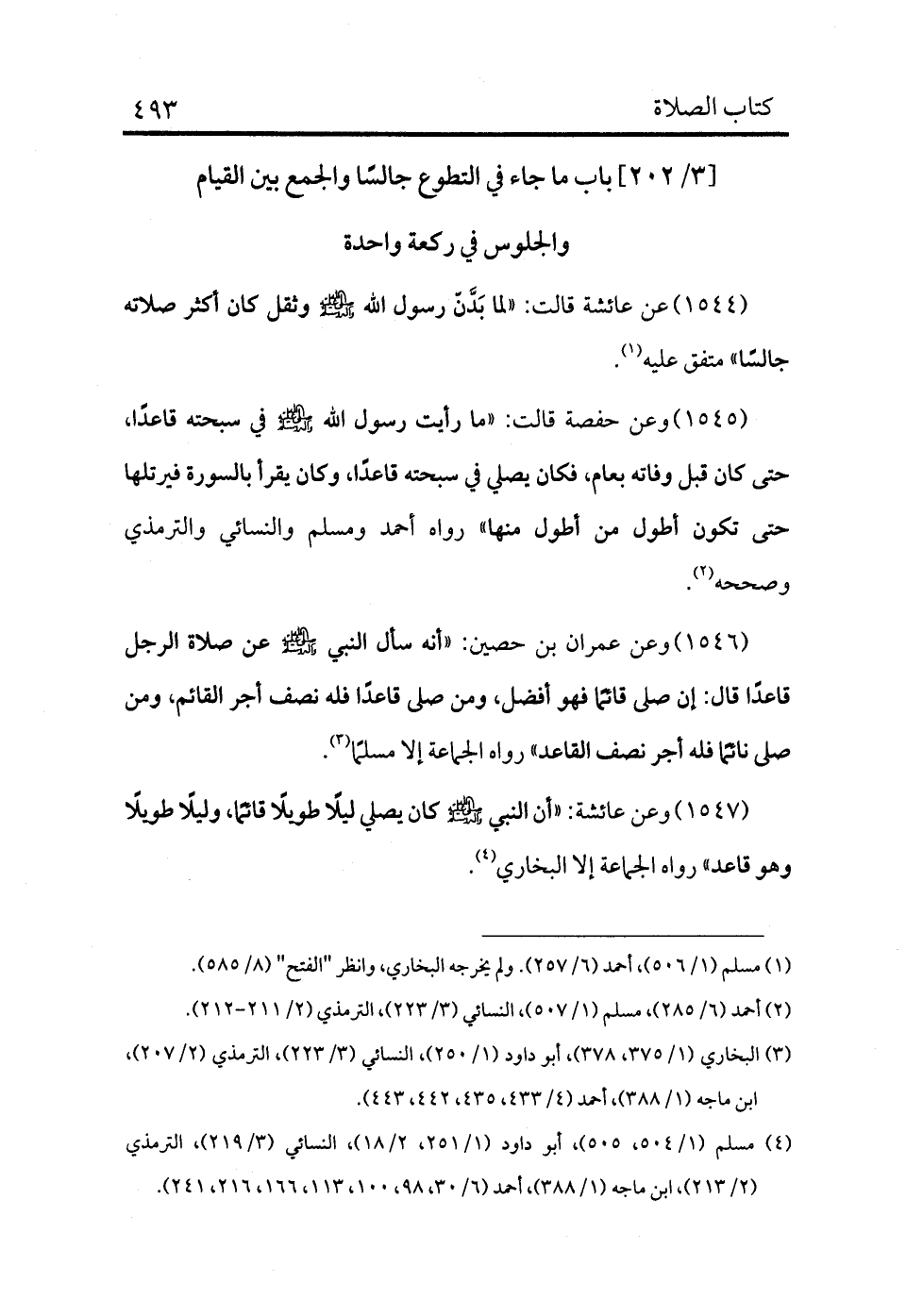 1547 - وعن عائشة: «أن النبي - صلى الله عليه وسلم - كان يصلي ليلًا طويلًا قائمًا، وليلًا طويلًا وهو قاعد» رواه الجماعة إلا البخاري (¬4) .