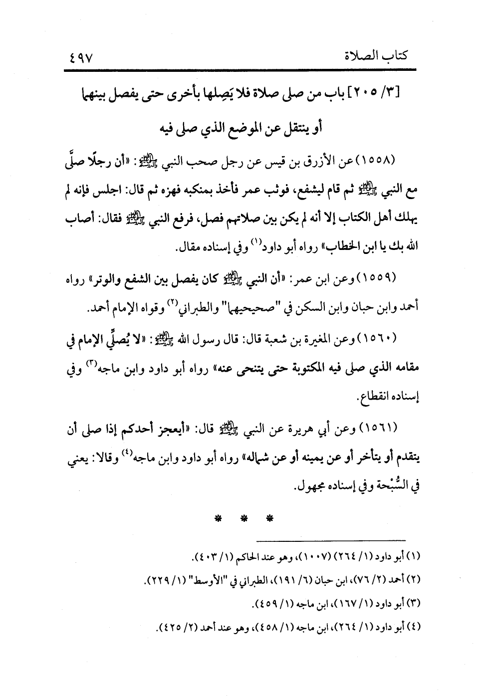 1558 - عن الأزرق بن قيس عن رجل صحب النبي - صلى الله عليه وسلم -: «أن رجلًا صلَّى مع النبي - صلى الله عليه وسلم - ثم قام ليشفع، فوثب عمر فأخذ بمنكبه فهزه ثم قال: اجلس فإنه لم يهلك أهل الكتاب إلا أنه لم يكن بين صلاتهم فصل، فرفع النبي - صلى الله عليه وسلم - فقال: أصاب الله بك يا ابن الخطاب» رواه أبو داود (¬1) وفي إسناده مقال.