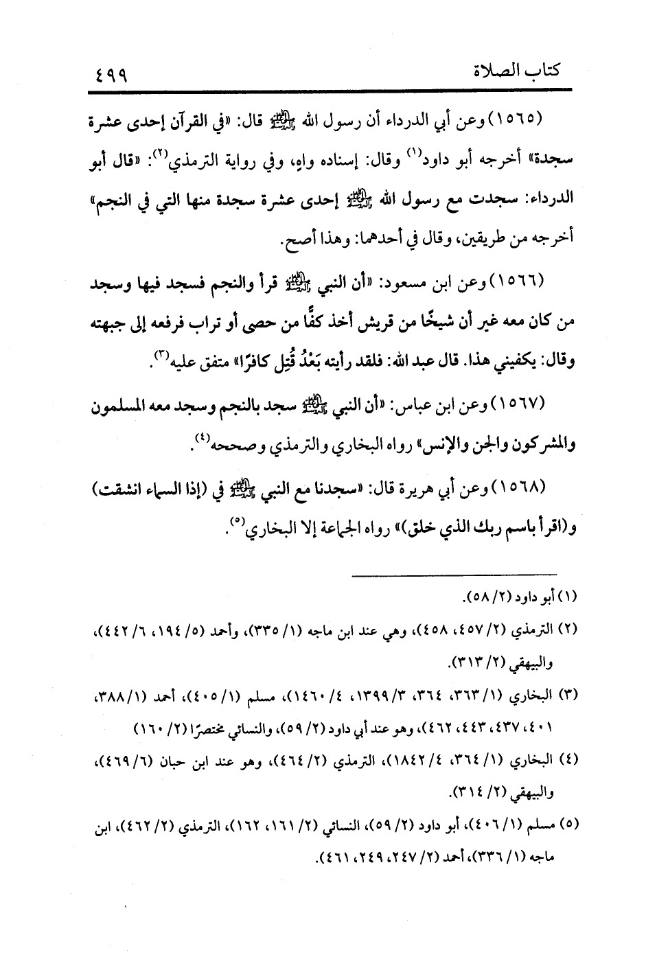 1568 - وعن أبي هريرة قال: «سجدنا مع النبي - صلى الله عليه وسلم - في (إذا السماء انشقت) و (اقرأ باسم ربك الذي خلق) » رواه الجماعة إلا البخاري (¬5) .