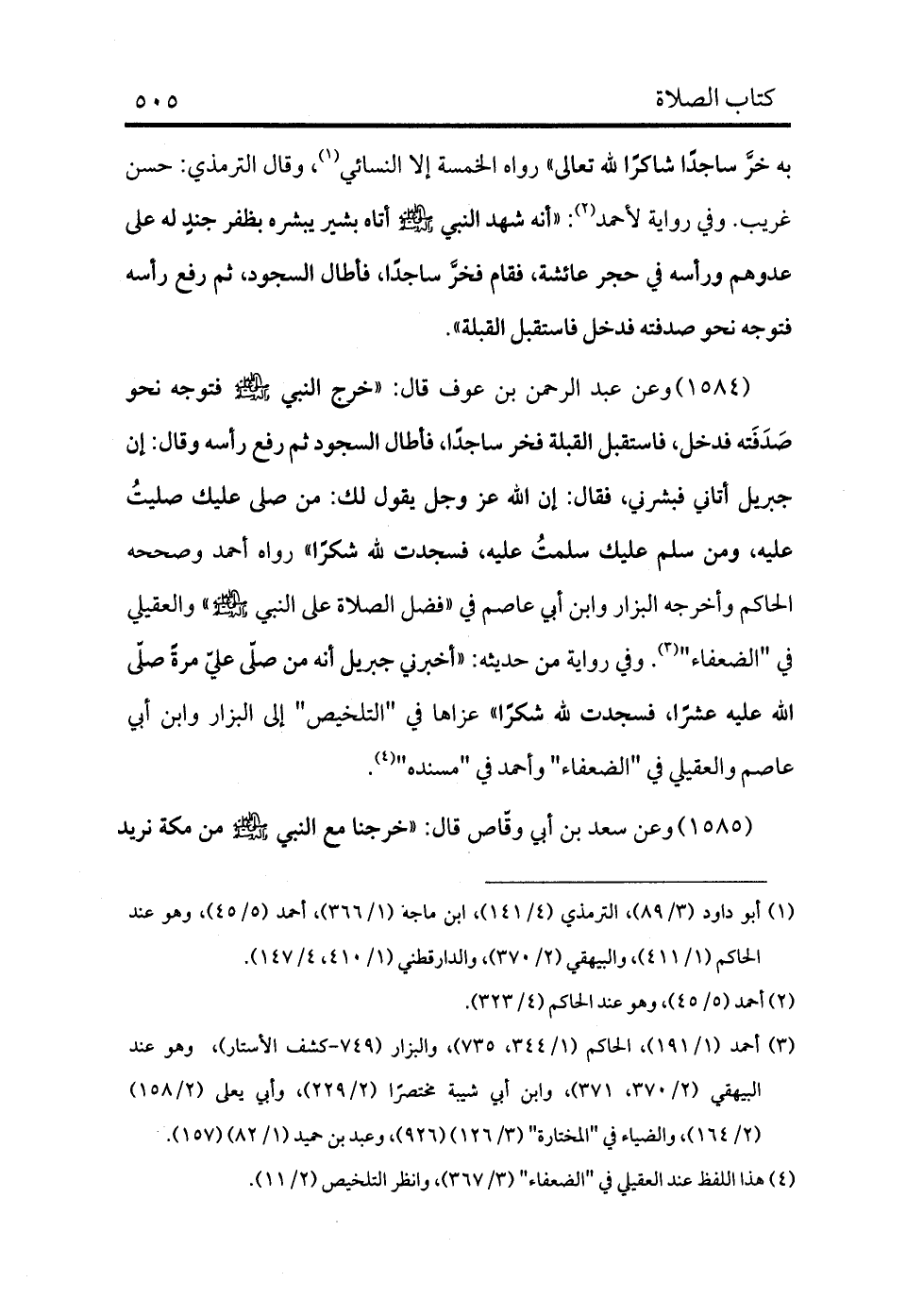 1584 - وعن عبد الرحمن بن عوف قال: «خرج النبي - صلى الله عليه وسلم - فتوجه نحو صَدَفَته فدخل، فاستقبل القبلة فخر ساجدًا، فأطال السجود ثم رفع رأسه وقال: إن جبريل أتاني فبشرني، فقال إن الله عز وجل يقول لك: من صلى عليك صليتُ عليه، ومن سلم عليك سلمتُ عليه، فسجدت لله شكرًا» رواه أحمد وصححه الحاكم وأخرجه البزار وابن أبي عاصم في فضل الصلاة على النبي - صلى الله عليه وسلم - والعقيلي في "الضعفاء" (¬3) . وفي رواية من حديثه: «أخبرني جبريل أنه من صلّى عليّ مرةً صلّى الله عليه عشرًا، فسجدت لله شكرًا» عزاها في "التلخيص" إلى البزار وابن أبي عاصم والعقيلي في "الضعفاء" وأحمد في "مسنده" (¬4) .
