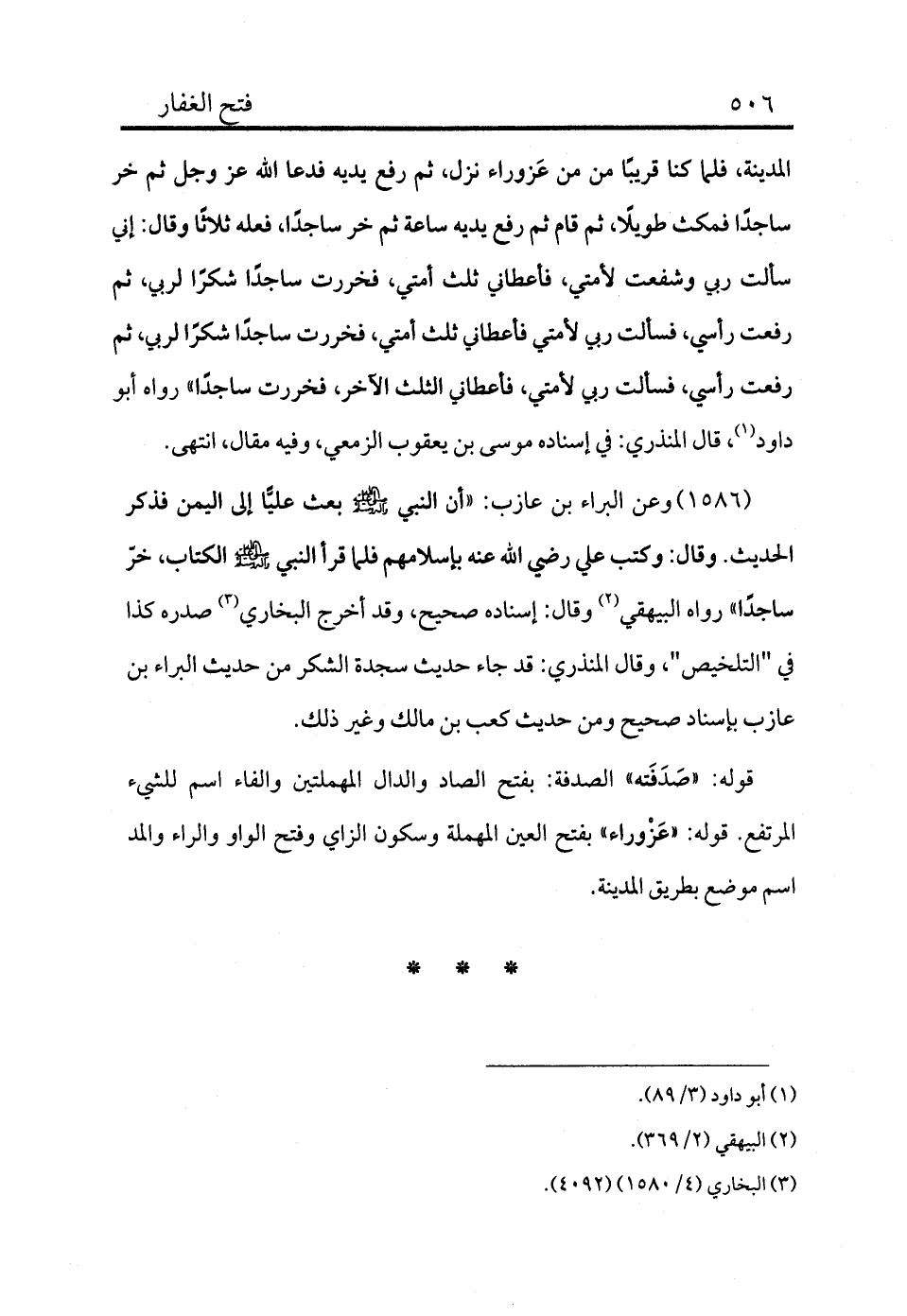 1586 - وعن البراء بن عازب: «أن النبي - صلى الله عليه وسلم - بعث عليًا إلى اليمن فذكر الحديث: قال: وكتب علي رضي الله عنه بإسلامهم فلما قرأ النبي - صلى الله عليه وسلم - الكتاب، خرّ ساجدًا» رواه البيهقي (¬2) وقال: إسناده صحيح، وقد أخرج البخاري (¬3) صدره كذا في "التلخيص"، وقال المنذري: قد جاء حديث سجدة الشكر من حديث البراء بن عازب بإسناد صحيح ومن حديث كعب بن مالك وغير ذلك.