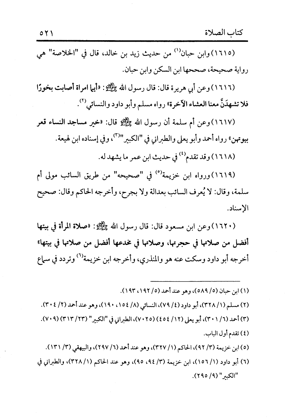 1617 - وعن أم سلمة أن رسول الله - صلى الله عليه وسلم - قال: «خير مساجد النساء قعر بيوتهن» رواه أحمد وأبو يعلى والطبراني في "الكبير" (¬3) ، وفي إسناده ابن لهيعة.