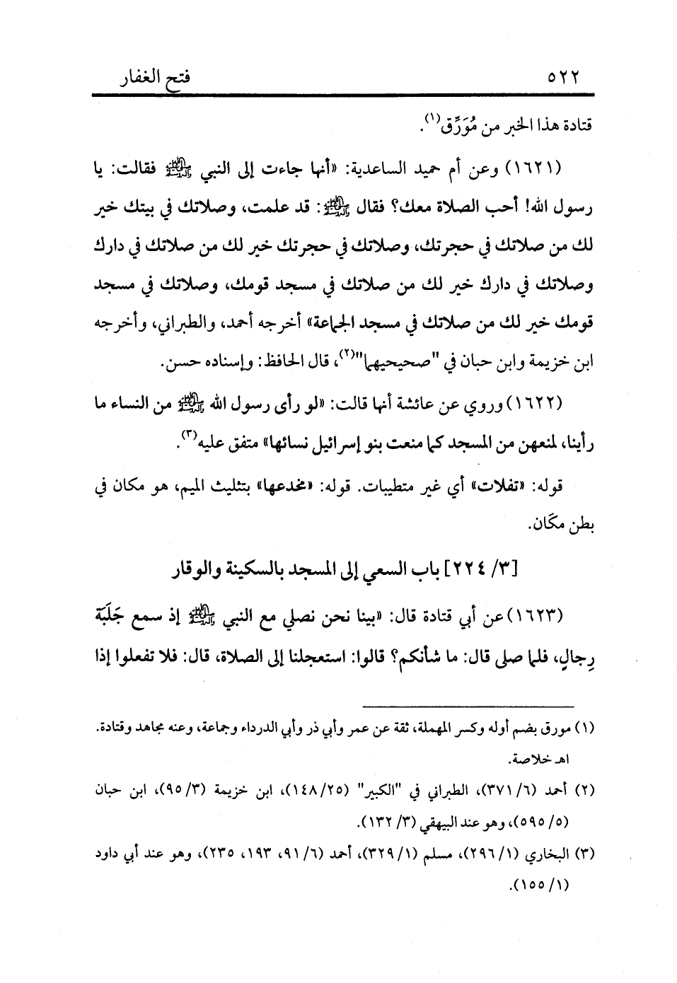 1621 - وعن أم حميد الساعدية: «أنها جاءت إلى النبي - صلى الله عليه وسلم - فقالت: يا رسول الله! أحب الصلاة معك؟ فقال - صلى الله عليه وسلم -: قد علمت، وصلاتك في بيتك خير لك من صلاتك في حجرتك، وصلاتك في حجرتك خير لك من صلاتك في دارك وصلاتك في دارك خير لك من صلاتك في مسجد قومك، وصلاتك في مسجد قومك خير لك من صلاتك في مسجد الجماعة» أخرجه أحمد، الطبراني، وأخرجه ابن خزيمة وابن حبان في "صحيحيهما" (¬2) ، قال الحافظ: وإسناده حسن.