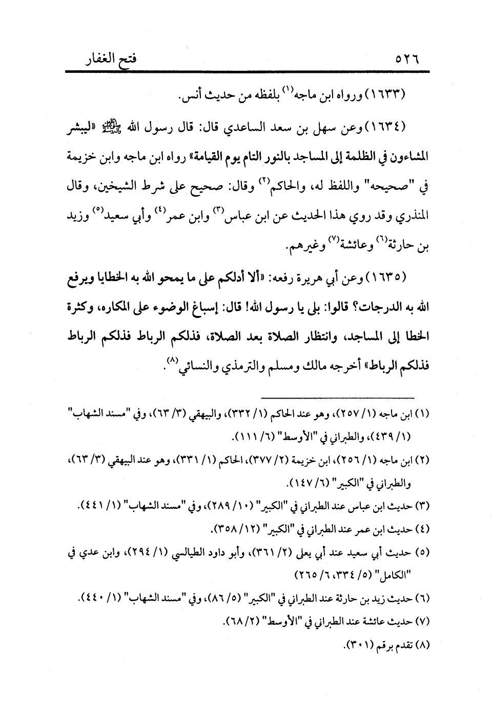 1634 - وعن سهل بن سعد الساعدي قال: قال رسول الله - صلى الله عليه وسلم - «ليبشر المشاءون في الظلمة إلى المساجد بالنور التام يوم القيامة» رواه ابن ماجه وابن خزيمة في "صحيحه" واللفظ له، والحاكم (¬2) وقال: صحيح على شرط الشيخين، وقال المنذري وقد روي هذا الحديث عن ابن عباس (¬3) وابن عمر (¬4) وأبي سعيد (¬5) وزيد بن حارثة (¬6) وعائشة (¬7) وغيرهم.