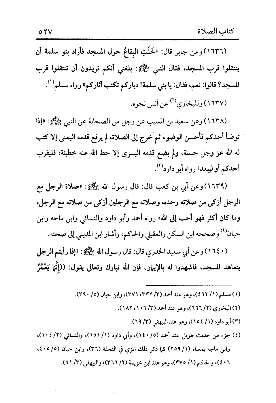 1636 - وعن جابر قال: «قلت: البقاع حول المسجد فأراد بنو سلمة أن ينتقلوا قرب المسجد، فقال النبي - صلى الله عليه وسلم -: بلغني أنكم تريدون أن تنتقلوا قرب المسجد؟ قالوا: نعم، فقال: يا بني سلمة! دياركم تكتب آثاركم» رواه مسلم (¬1) .