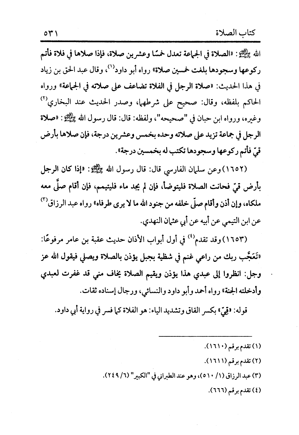 1652 - وعن سلمان الفارسي قال: قال رسول الله - صلى الله عليه وسلم -: «إذا كان الرجل بأرض قيّ فحانت الصلاة فليتوضأ، فإن لم يجد ماء فليتيمم، فإن أقام صلَّى معه ملكاه، وإن أذن وأقام صلّى خلفه من جنود الله ما لا يرى طرفاه» رواه عبد الرزاق (¬3) عن ابن التيمي عن أبيه عن أبي عثمان النهدي.