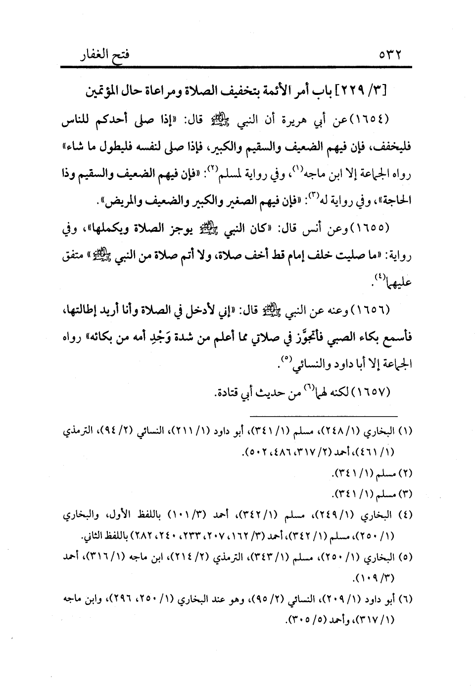 1654 - عن أبي هريرة أن النبي - صلى الله عليه وسلم - قال: «إذا صلى أحدكم للناس فليخفف، فإن فيهم الضعيف والسقيم والكبير، فإذا صلى لنفسه فليطول ما شاء» رواه الجماعة إلا ابن ماجه (¬1) ، وفي رواية لمسلم (¬2) : «فإن فيهم الضعيف والسقيم وذا الحاجة» ، وفي رواية له (¬3) : «فإن فيهم الصغير والكبير والضعيف والمريض» .