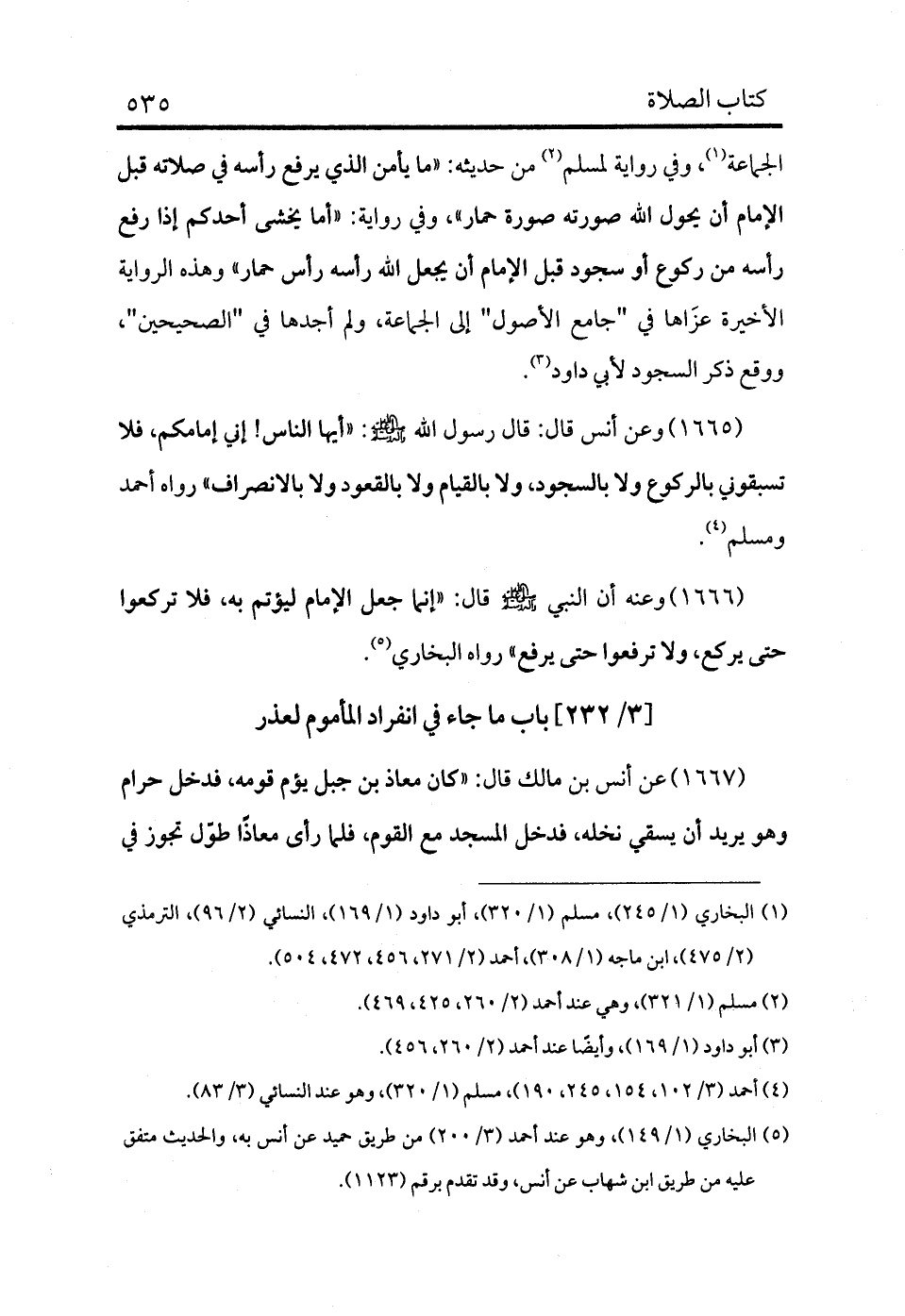 1665 - وعن أنس قال: قال رسول الله - صلى الله عليه وسلم -: «أيها الناس! إني إمامكم، فلا تسبقوني بالركوع ولا بالسجود، ولا بالقيام ولا بالقعود ولا بالانصراف» رواه أحمد ومسلم (¬4) .