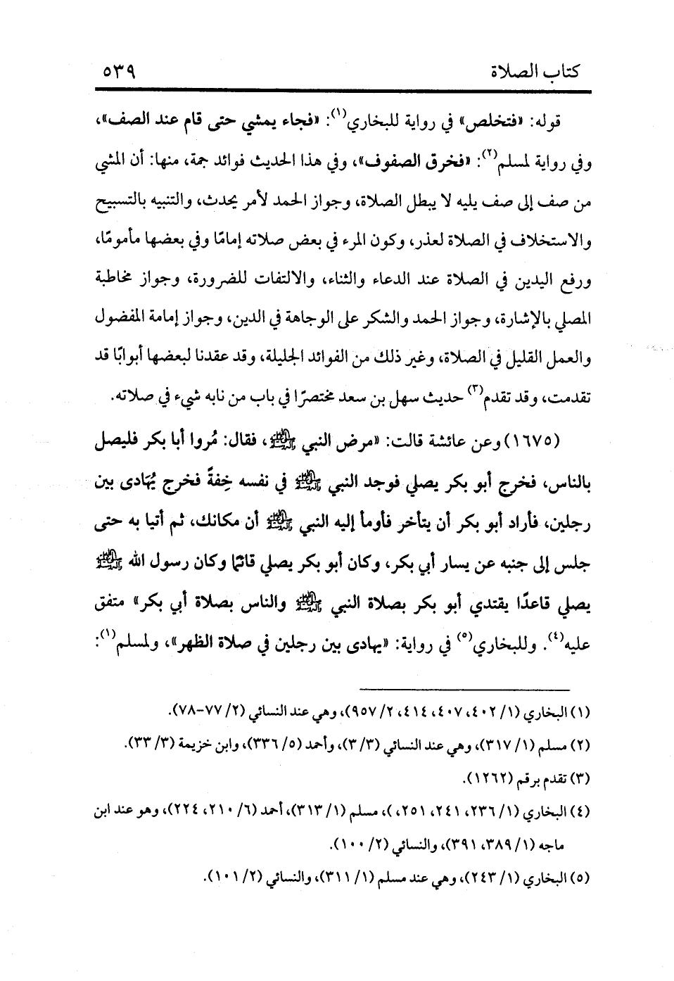 1675 - وعن عائشة قالت: «مرض النبي - صلى الله عليه وسلم -، فقال: مُروا أبا بكر فليصل بالناس، فخرج أبو بكر يصلي فوجد النبي - صلى الله عليه وسلم - في نفسه خِفةً فخرج يُهَادى بين رجلين، فأراد أبو بكر أن يتأخر فأومأ إليه النبي - صلى الله عليه وسلم - أن مكانك، ثم أتيا به حتى جلس إلى جنبه عن يسار أبي بكر، وكان أبو بكر يصلي قائمًا وكان رسول الله - صلى الله عليه وسلم - يصلي قاعدًا يقتدي أبو بكر بصلاة النبي - صلى الله عليه وسلم - والناس بصلاة أبي بكر» متفق عليه (¬4) . وللبخاري (¬5) في رواية: «يهادى بين رجلين في صلاة الظهر» ، ولمسلم (¬6)