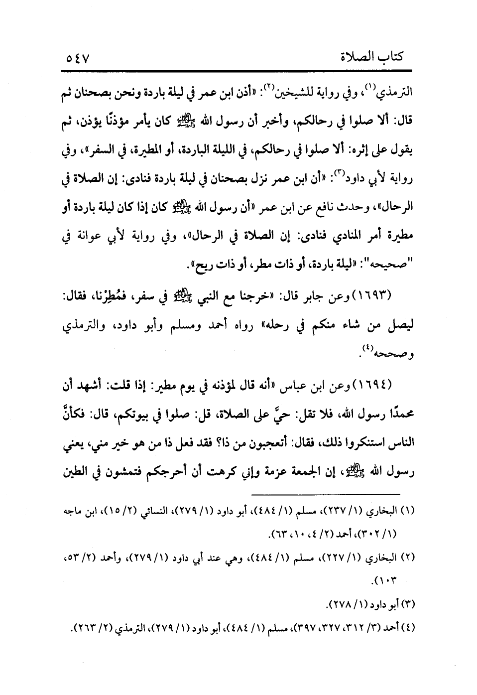 1693 - وعن جابر قال: «خرجنا مع النبي - صلى الله عليه وسلم - في سفر، فمطرنا، فقال: ليصل من شاء منكم في رحله» رواه أحمد ومسلم وأبو داود، والترمذي وصححه (¬4) .