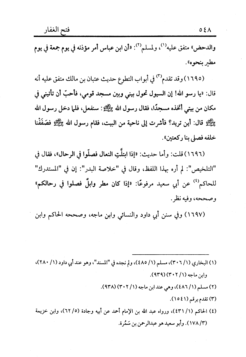 1696 - قلت: وأما حديث: «إذا ابتلت النعال فصلوا في الرحال» ، فقال في "التلخيص": لم أره بهذا اللفظ، وقال في "خلاصة البدر": إن في "المستدرك" للحاكم (¬4) عن أبي سعيد مرفوعًا: «إذا كان مطر وابلٌ فصلوا في رحالكم» وصححه، وفيه نظر.