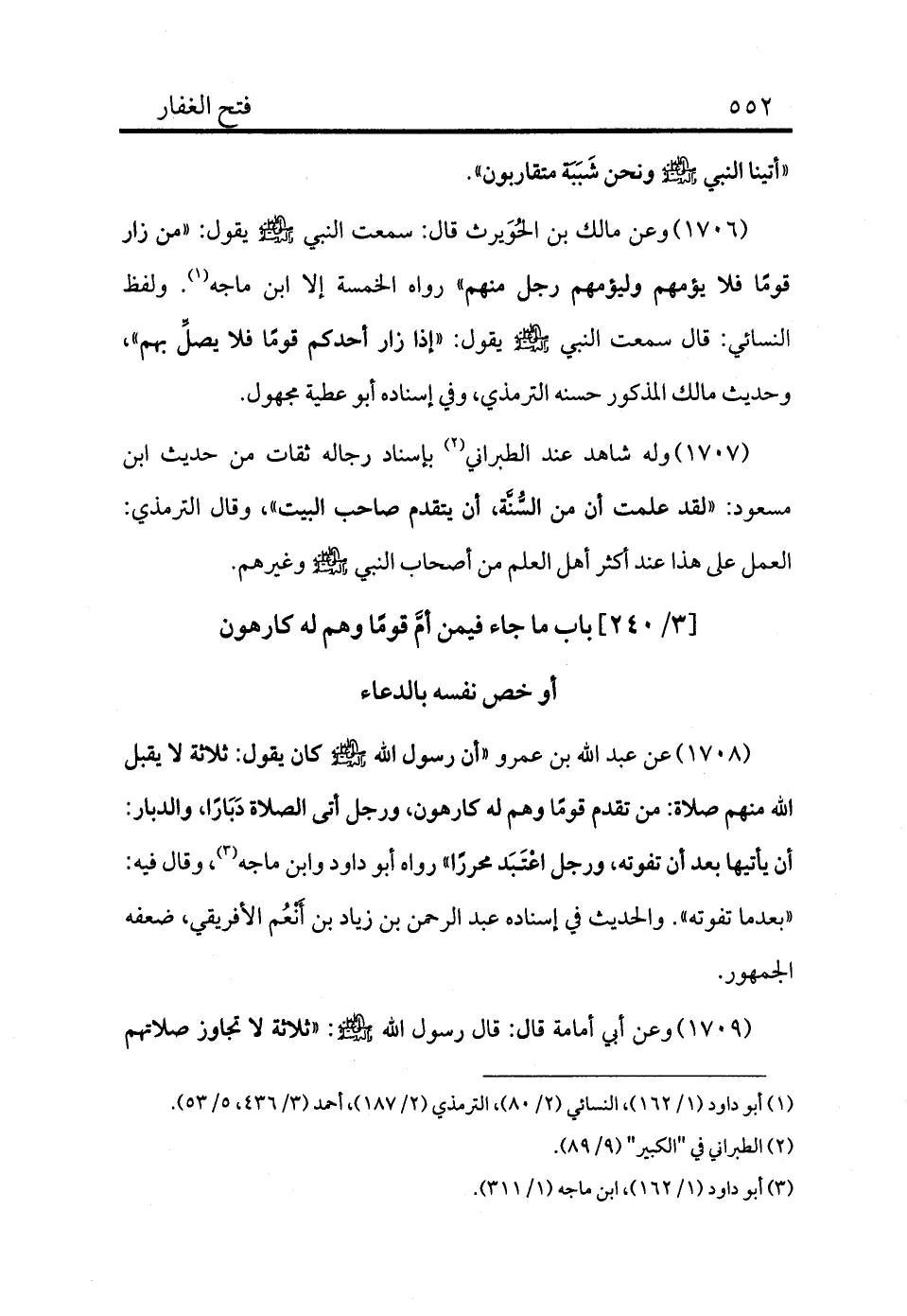 1708 - عن عبد الله بن عمرو «أن رسول الله - صلى الله عليه وسلم - كان يقول: ثلاثة لا يقبل الله منهم صلاة من تقدم قومًا وهم له كارهون، ورجل أتى الصلاة دَبَارًا، والدبار: أن يأتيها بعد أن تفوته، ورجل أَعْبَدَ محررًا» رواه أبو داود وابن ماجه (¬3) ، وقال فيه: بعدما تفوته. والحديث في إسناده عبد الرحمن بن زيادة بن أَنْعُم الأفريقي، ضعفه الجمهور.