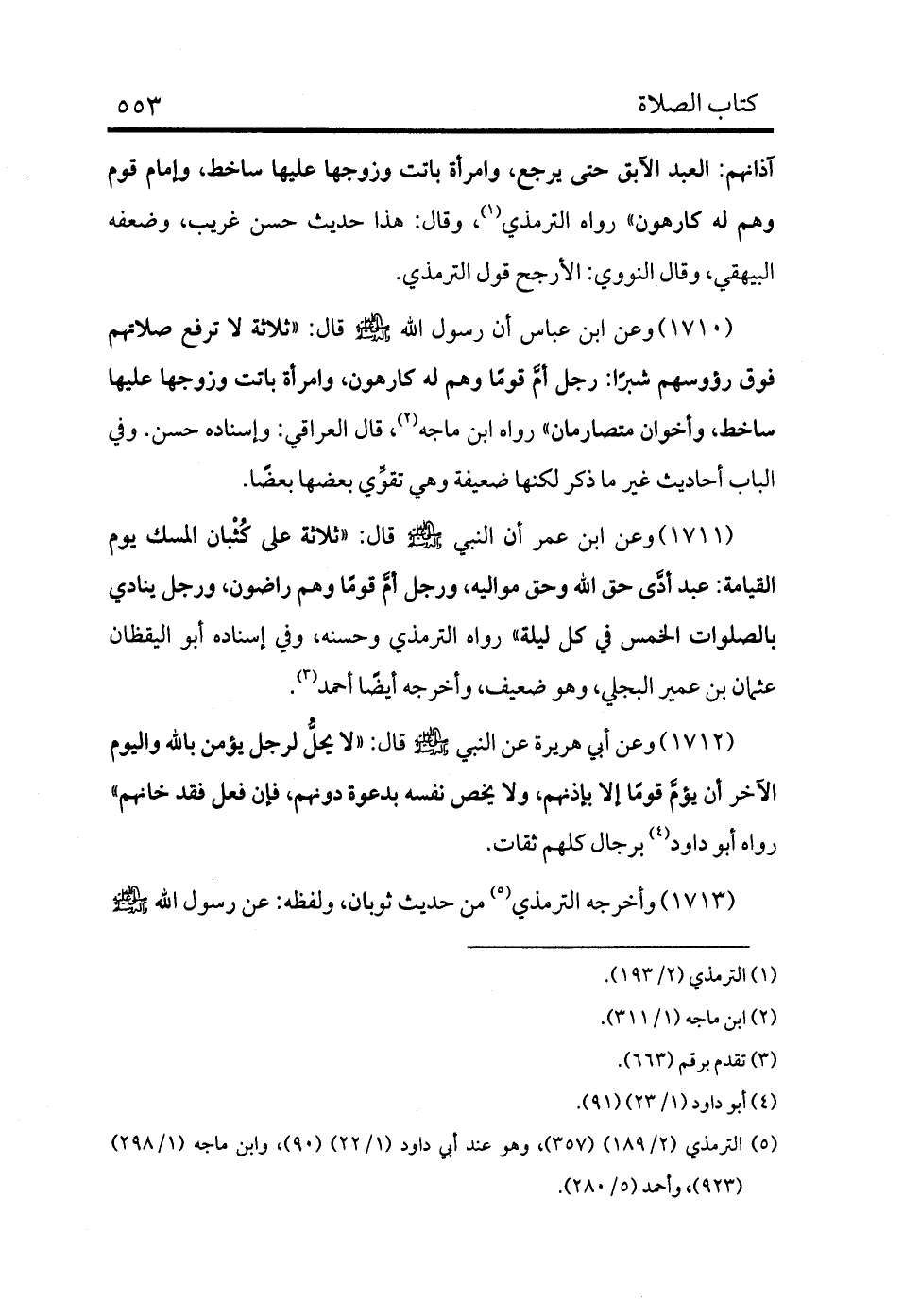 1710 - وعن ابن عباس أن رسول الله - صلى الله عليه وسلم - قال: «ثلاثة لا ترفع صلاتهم فوق رءوسهم شبرًا: رجل أم قومًا وهم له كارهون، وامرأة باتت وزوجها عليها ساخط، وأخوان متصارمان» رواه ابن ماجه (¬2) ، قال العراقي: وإسناده حسن. وفي الباب أحاديث غير ما ذكر لكنها ضعيفة وهي تقوي بعضها بعضًا.