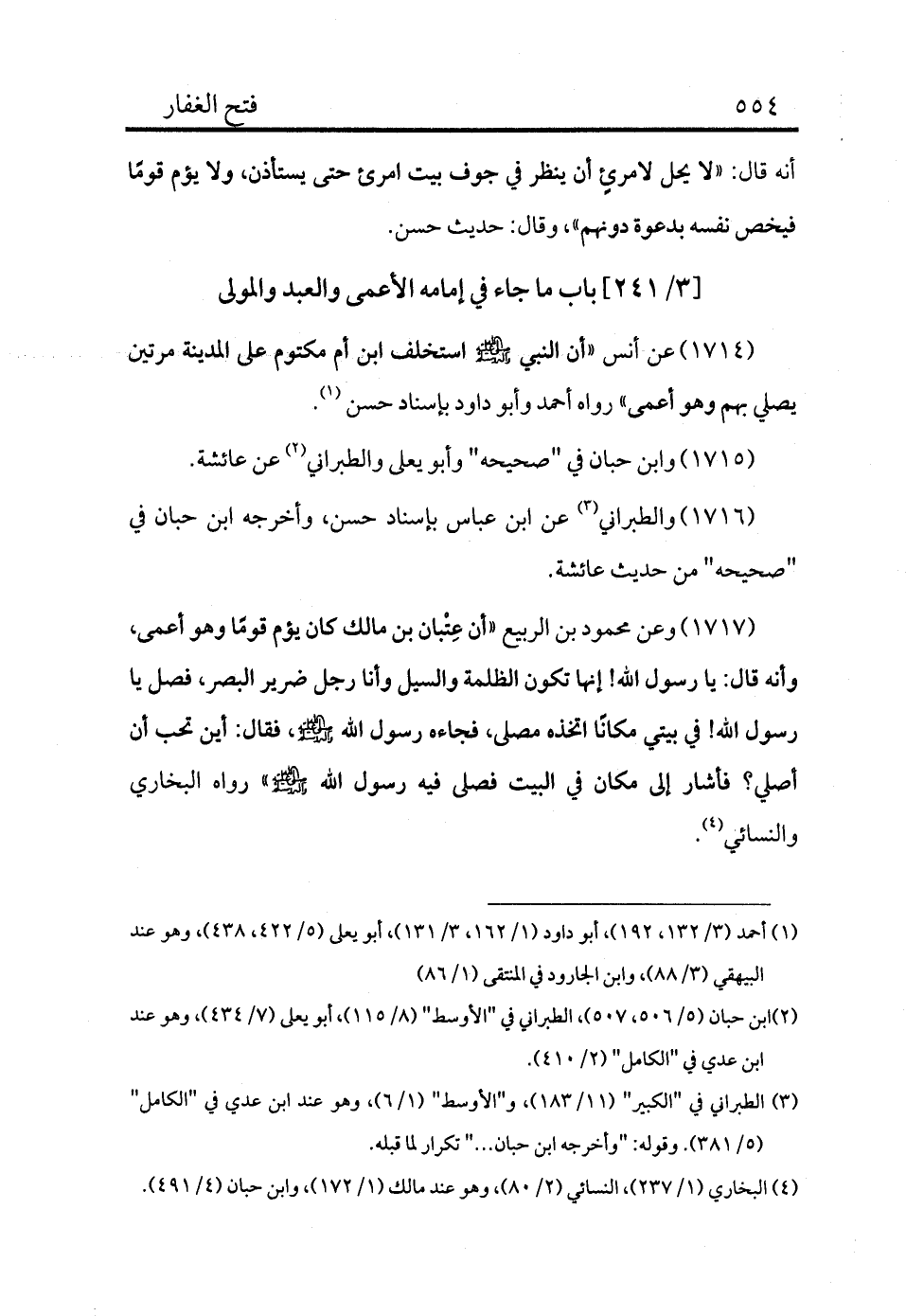 1714 - عن أنس «أن النبي - صلى الله عليه وسلم - استخلف ابن أم مكتوم على المدينة مرتين يصلي بهم وهو أعمى» رواه أحمد وأبو داود بإسناد حسن (¬1) .