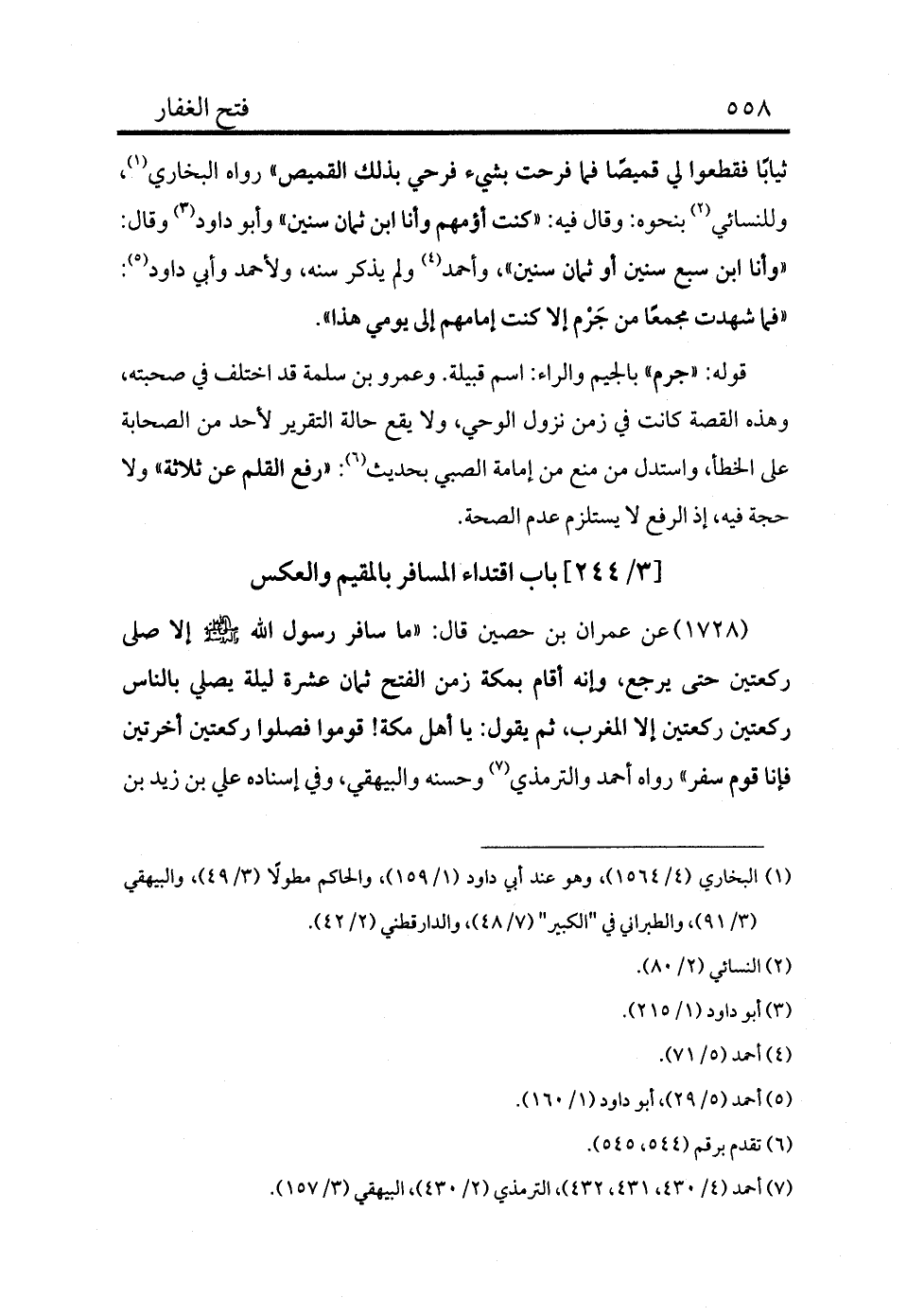 1728 - عن عمران بن حصين قال: «ما سافر رسول الله - صلى الله عليه وسلم - إلا صلى ركعتين حتى يرجع، وإنه أقام بمكة زمن الفتح ثمان عشرة ليلة يصلي بالناس ركعتين ركعتين إلا المغرب، ثم يقول: يا أهل مكة! قوموا فصلوا ركعتين أخرتين فإنا قوم سفر» رواه أحمد والترمذي (¬6) وحسنه والبيهقي، وفي إسناده علي بن زيد بن