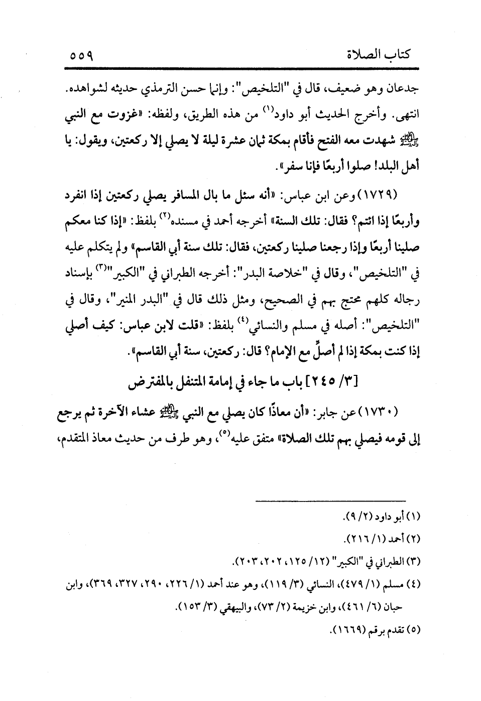 1729 - وعن ابن عباس: «أنه سئل ما بال المسافر يصلي ركعتين إذا انفرد وأربعًا إذا ائتم؟ فقال: تلك السنة» أخرجه أحمد في مسنده (¬2) بلفظ: «إذا كنا معكم صلينا أربعًا وإذا رجعنا صلينا ركعتين، فقال: تلك سنة أبي القاسم» ولم يتكلم عليه في "التلخيص"، وقال في "خلاصة البدر": أخرجه الطبراني في "الكبير" (¬3) بإسناد رجاله كلهم محتج بهم في الصحيح، ومثل ذلك قال في "البدر المنير"، وقال في "التلخيص": أصله في مسلم والنسائي (¬4) بلفظ: «قلت لابن عباس: كيف أصلي إذا كنت بمكة إذا لم أصلِّ مع الإمام؟ قال: ركعتين، سنة أبي القاسم» .