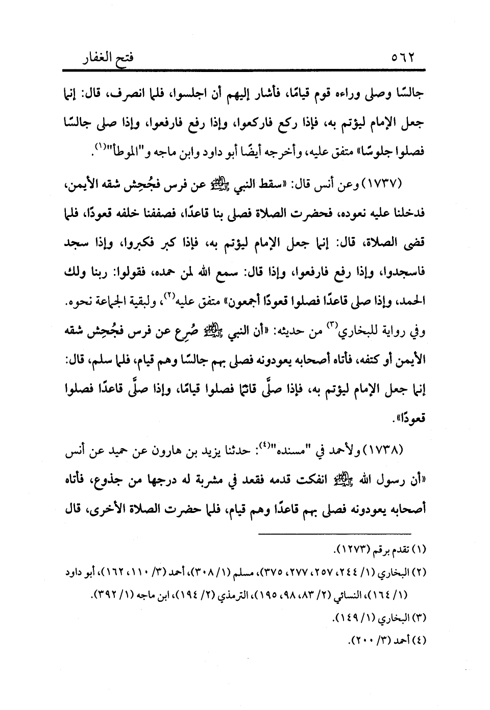 1738 - ولأحمد في مسنده (¬4) : حدثنا يزيد بن هارون عن حميد عن أنس «أن رسول الله - صلى الله عليه وسلم - انفكت قدمه فقعد في مشربة له درجها من جذوع، فأتاه أصحابه يعودونه فصلى بهم قاعدًا وهم قيام، فلما حضرت الصلاة الأخرى، قال