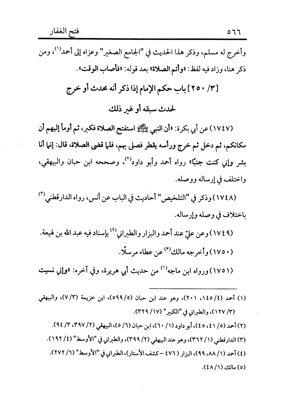 1747 - عن أبي بكرة: «أن النبي - صلى الله عليه وسلم - استفتح الصلاة فكبر، ثم أومأ إليهم أن مكانكم، ثم دخل ثم خرج ورأسه يقطر فصلى بهم، فلما قضى الصلاة، قال: إنما أنا بشر وإني كنت جنبًا» رواه أحمد وأبو داود (¬2) ، وصححه ابن حبان والبيهقي، واختلف في إرساله ووصله.