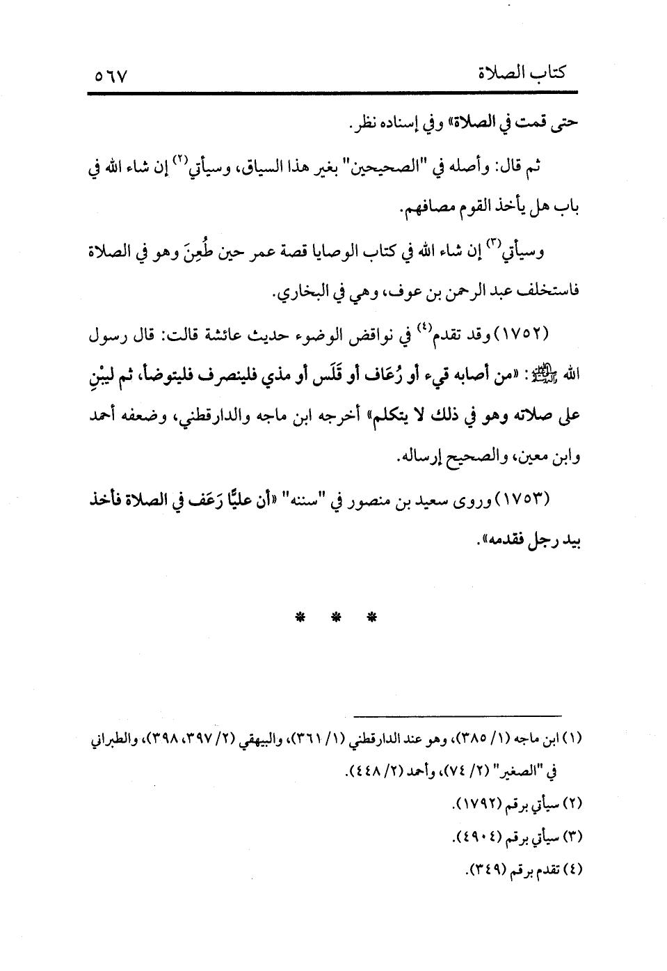 1752 - وقد تقدم (¬3) في نواقض الوضوء حديث عائشة قالت: قال رسول الله - صلى الله عليه وسلم -: «من أصابه قيء أو رعاف أو قَلَس أو مذي فلينصرف فليتوضأ، ثم ليبن على صلاته وهو في ذلك لا يتكلم» أخرجه ابن ماجه والدارقطني، وضعفه أحمد وابن معين، والصحيح إرساله.
