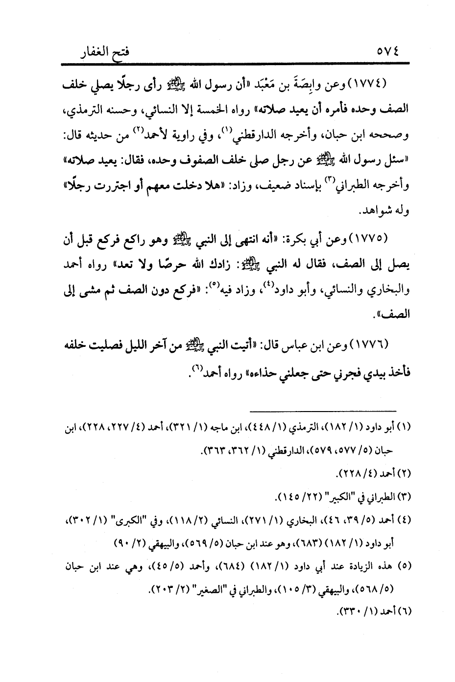 1776 - وعن ابن عباس قال: «أتيت النبي - صلى الله عليه وسلم - من آخر الليل فصليت خلفه فأخذ بيدي فجرني حتى جعلني حذاءه» رواه أحمد (¬6) .