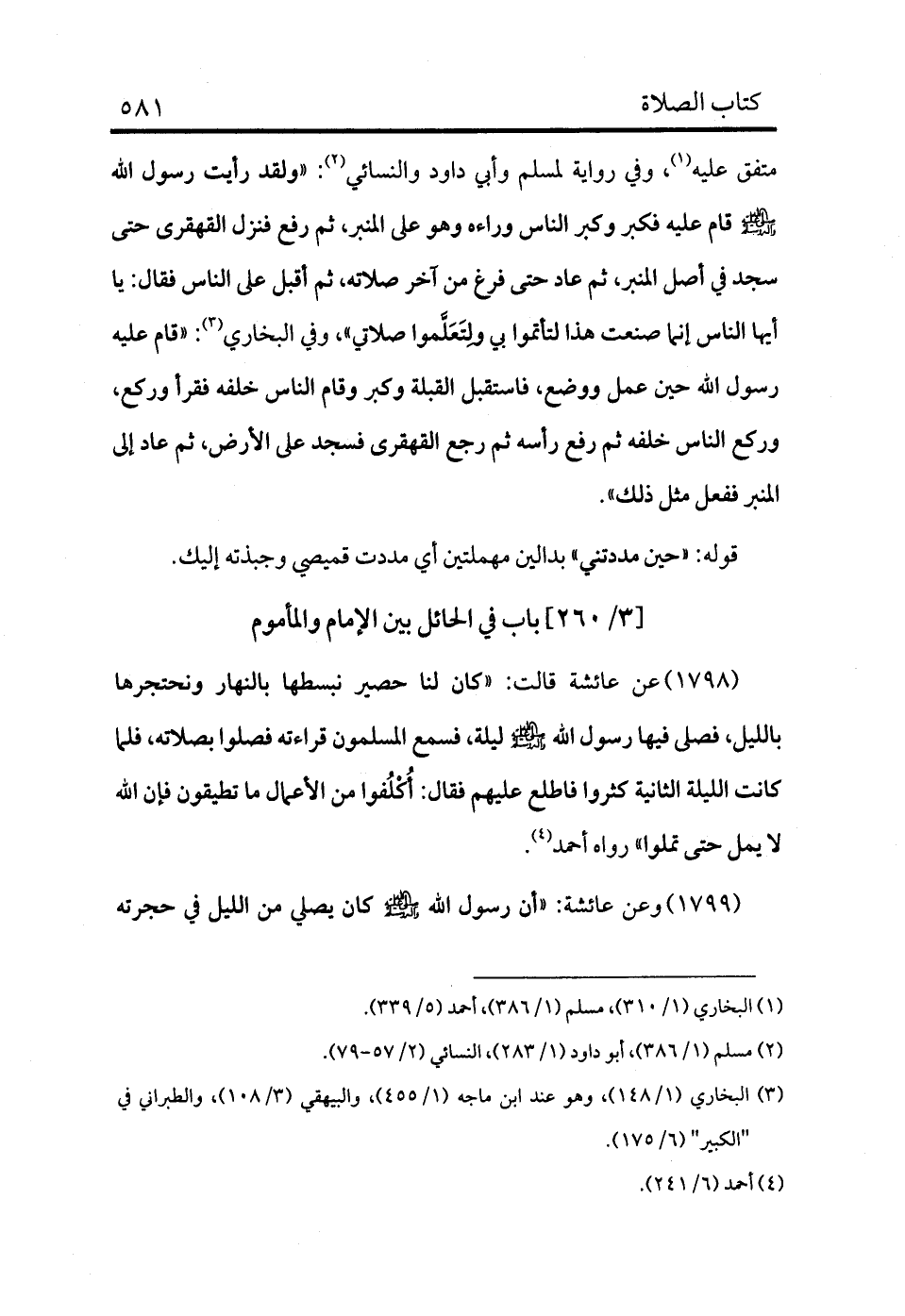 1798 - عن عائشة قالت: «كان لنا حصير نبسطها بالنهار ونحتجرها بالليل، فصلى فيها رسول الله - صلى الله عليه وسلم - ليلة، فسمع المسلمون قراءته فصلوا بصلاته، فلما كانت الليلة الثانية كثروا فاطلع عليهم فقال: أُكْلُفوا من الأعمال ما تطيقون فإن الله لا يمل حتى تملوا» رواه أحمد (¬2) .