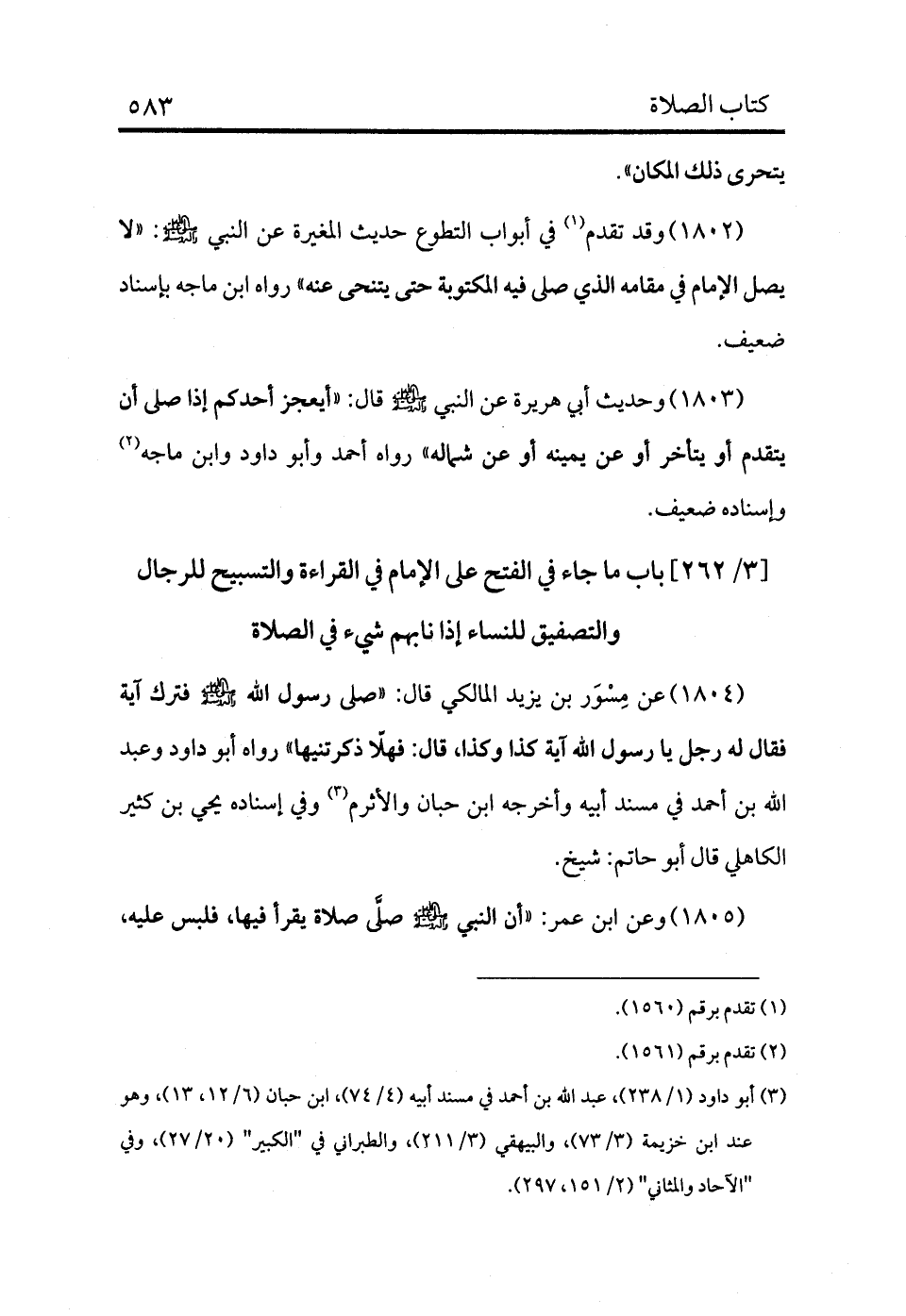 1802 - وقد تقدم (¬1) في أبواب التطوع حديث المغيرة عن النبي - صلى الله عليه وسلم -: «لا يصل الإمام في مقامه الذي صلى فيه المكتوبة حتى يتنحى عنه» رواه ابن ماجه بإسناد ضعيف.