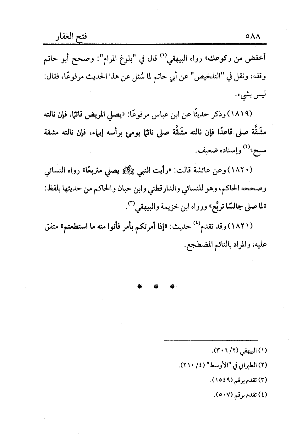 1819 - وذكر حديثًا عن ابن عباس مرفوعًا: «يصلي المريض قائمًا، فإن نالته مشقة صلى قاعدًا فإن نالته مشقة صلى نائمًا يومئ برأسه إيماء، فإن نالته مشقة سبح» (¬2) وإسناده ضعيف.