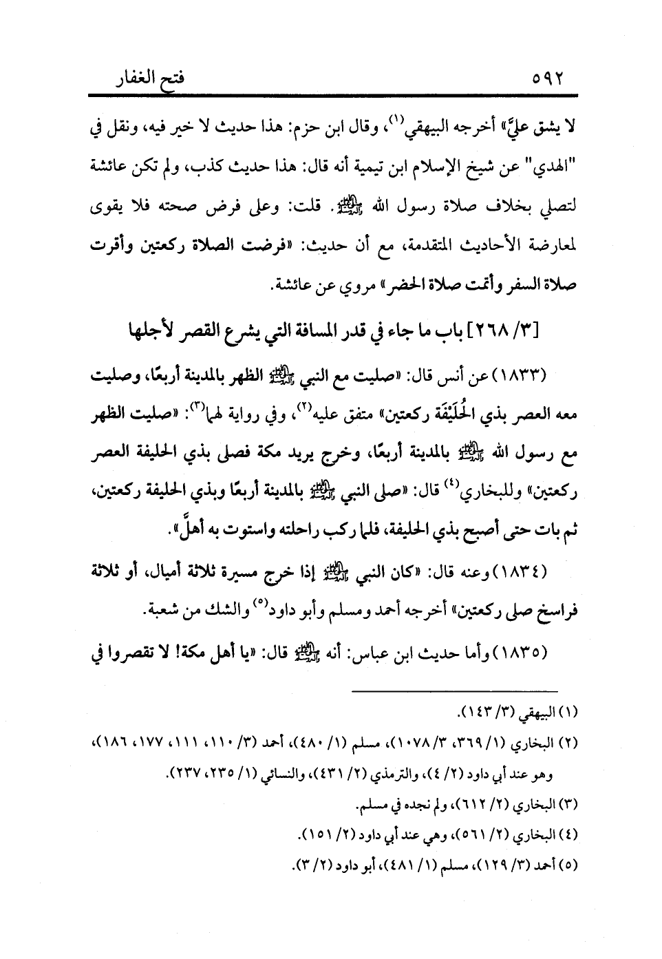 1834 - وعنه قال: «كان النبي - صلى الله عليه وسلم - إذا خرج مسيرة ثلاثة أميال، أو ثلاثة فراسخ صلى ركعتين» أخرجه أحمد ومسلم وأبو داود (¬5) والشك من شعبة.