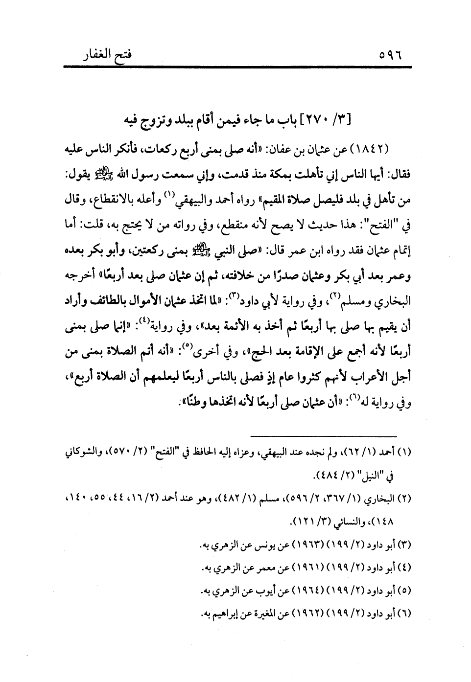 1842 - عن عثمان بن عفان: «أنه صلى بمنى أربع ركعات، فأنكر الناس عليه فقال: أيها الناس إني تأهلت بمكة منذ قدمت، وإني سمعت رسول الله - صلى الله عليه وسلم - يقول: من تأهل في بلد فليصل صلاة المقيم» رواه أحمد والبيهقي (¬1) وأعله بالانقطاع، وقال في "الفتح": هذا حديث لا يصح لأنه منقطع، وفي رواته من لا يحتج به، قلت: أما إتمام عثمان فقد رواه ابن عمر قال: «صلى النبي - صلى الله عليه وسلم - بمنى ركعتين، وأبو بكر بعده وعمر بعد أبي بكر وعثمان صدرًا من خلافته، ثم إن عثمان صلى بعد أربعًا» أخرجه البخاري ومسلم (¬2) ، وفي رواية لأبي داود (¬3) : «لما اتخذ عثمان الأموال بالطائف وأراد أن يقيم بها صلى أربعًا ثم أخذ به الأئمة بعد» ، وفي رواية (¬4) : «إنما صلى بمنى أربعًا لأنه أجمع على الإقامة بعد الحج» ، وفي أخرى (¬5) : «أنه أتم الصلاة بمنى من أجل الأعراب لأنهم كثروا عام إذ صلى بالناس أربعًا ليعلمهم أن الصلاة أربع» ، وفي رواية له (¬6) : «أن عثمان صلى أربعًا لأنه اتخذها وطنًا» .