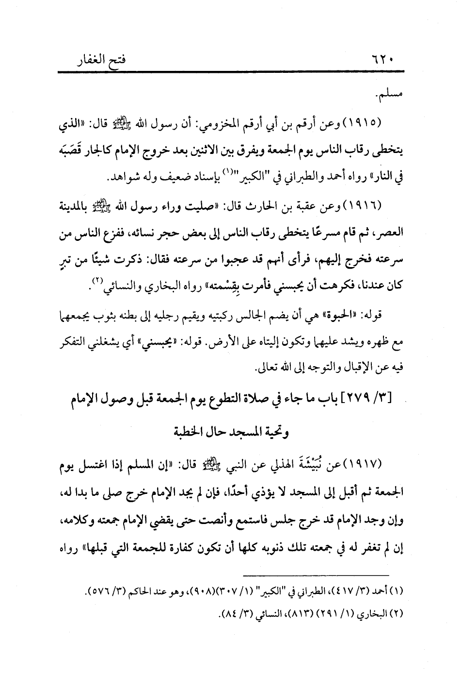 1915 - وعن أرقم بن أبي أرقم المخزومي: أن رسول الله - صلى الله عليه وسلم - قال: «الذي يتخطى رقاب الناس يوم الجمعة ويفرق بين الاثنين بعد خروج الإمام كالجار قَصَبَه في النار» رواه أحمد والطبراني في "الكبير" (¬1) بإسناد ضعيف وله شواهد.