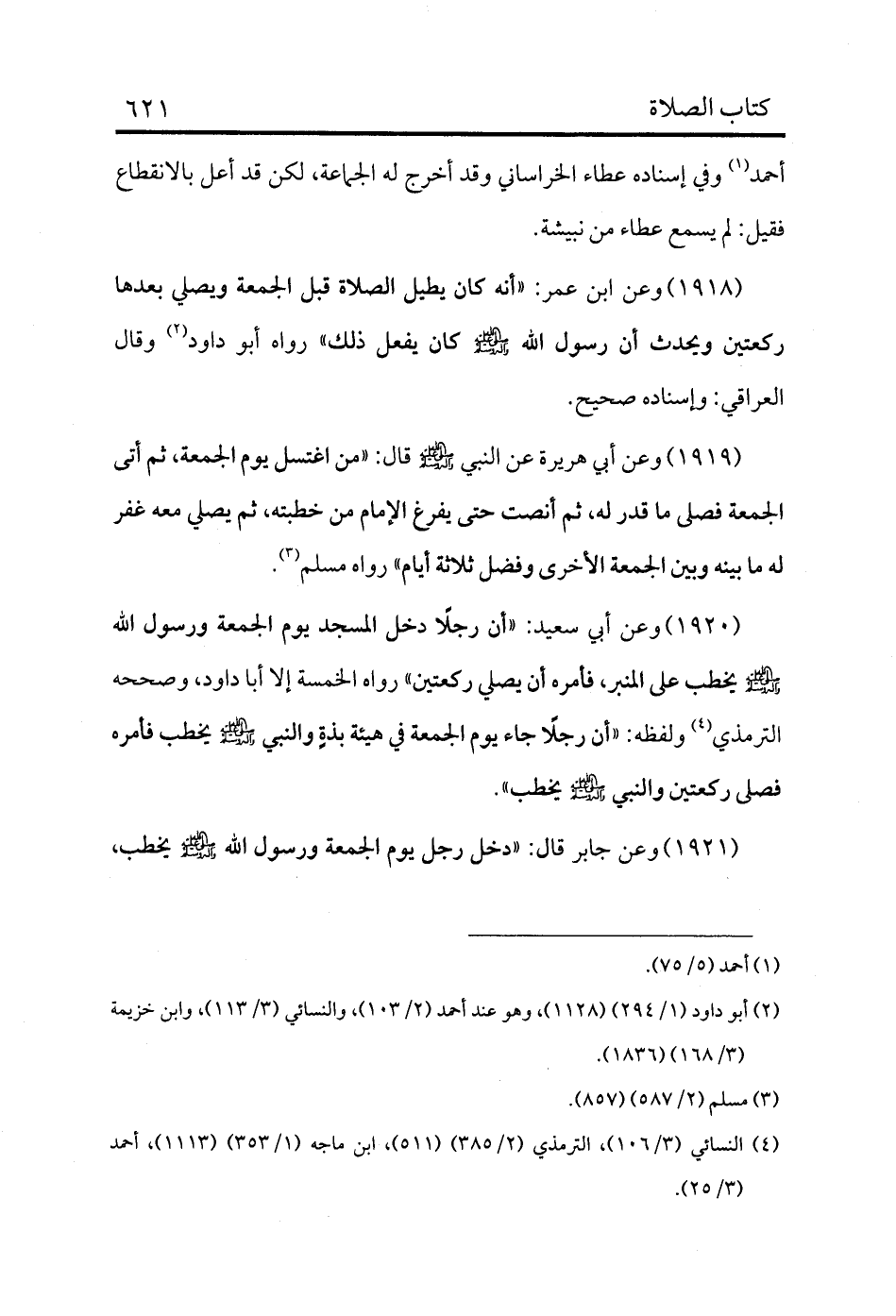 1918 - وعن ابن عمر: «أنه كان يطيل الصلاة قبل الجمعة ويصلي بعدها ركعتين ويحدث أن رسول الله - صلى الله عليه وسلم - كان يفعل ذلك» رواه أبو داود (¬2) وقال العراقي: وإسناده صحيح.