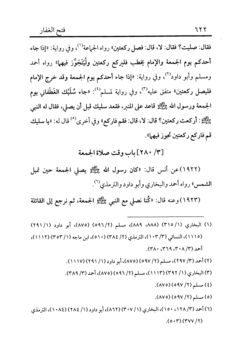 1922 - عن أنس قال: «كان رسول الله - صلى الله عليه وسلم - يصلي الجمعة حين تميل الشمس» رواه أحمد والبخاري وأبو داود والترمذي (¬6) .