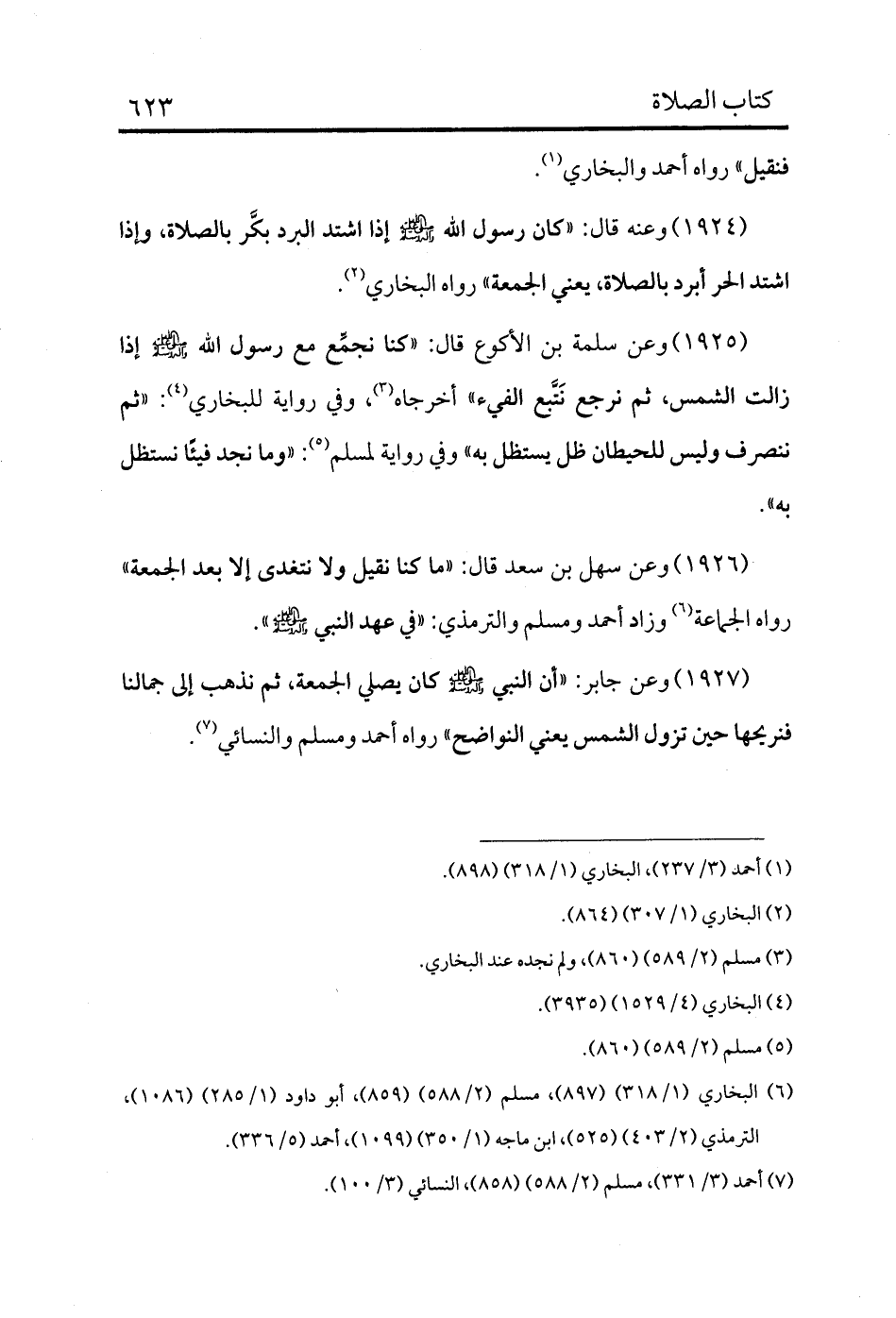 1925 - وعن سلمة بن الأكوع قال: «كنا نجمِّع مع رسول الله - صلى الله عليه وسلم - إذا زالت الشمس، ثم نرجع نَتَّبع الفيء» أخرجاه (¬3) ، وفي رواية للبخاري (¬4) : «ثم ننصرف وليس للحيطان ظل يستظل به» وفي رواية لمسلم (¬5) : «وما نجد فيئًا نستظل به» .