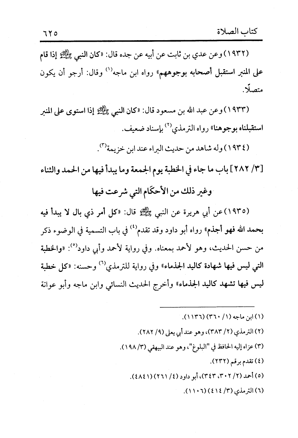 1933 - وعن عبد الله بن مسعود قال: «كان النبي - صلى الله عليه وسلم - إذا استوى على المنبر استقبلناه بوجوهنا» رواه الترمذي (¬2) بإسناد ضعيف.