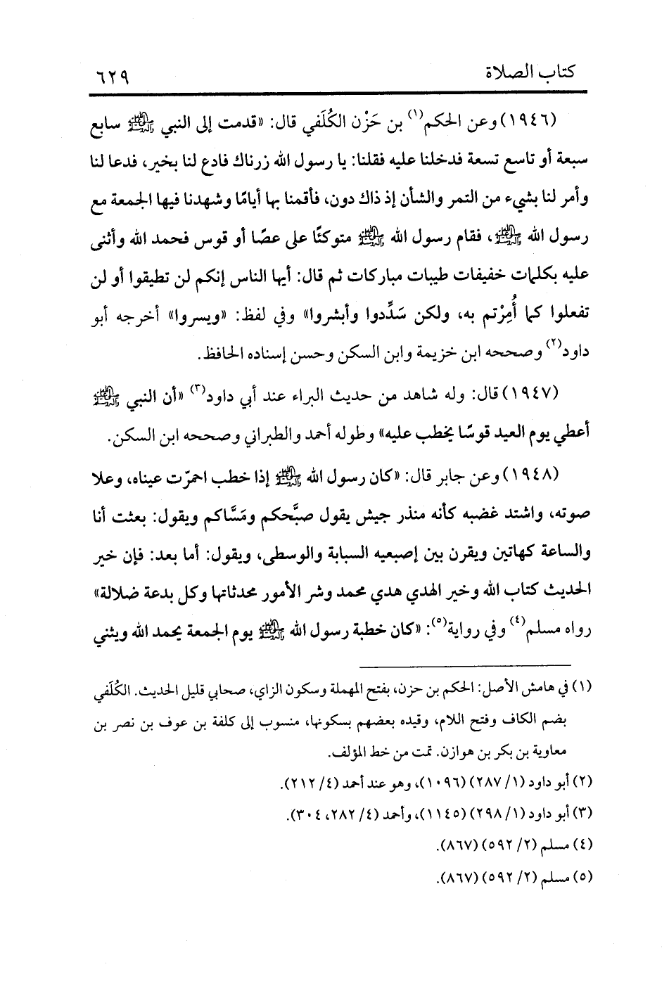 1946 - وعن الحكم (¬1) بن حَزْن الكُلَعي قال: «قدمت إلى النبي - صلى الله عليه وسلم - سابع سبعة أو تاسع تسعة فدخلنا عليه فقلنا: يا رسول الله زرناك فادع لنا بخير، فدعا لنا وأمر لنا بشيء من التمر والشأن إذ ذاك دون، فأقمنا بها أيامًا وشهدنا فيها الجمعة مع رسول الله - صلى الله عليه وسلم -، فقام رسول الله - صلى الله عليه وسلم - متوكئًا على عصًا أو قوس فحمد الله وأثنى عليه بكلمات خفيفات طيبات مباركات ثم قال: أيها الناس إنكم لن تطيقوا ولن تفعلوا كما أمرتم به، ولكن سددوا وأبشروا، وفي لفظ: ويسروا» أخرجه أبو داود (¬2) وصححه ابن خزيمة وابن السكن وحسن إسناده الحافظ (¬3) .