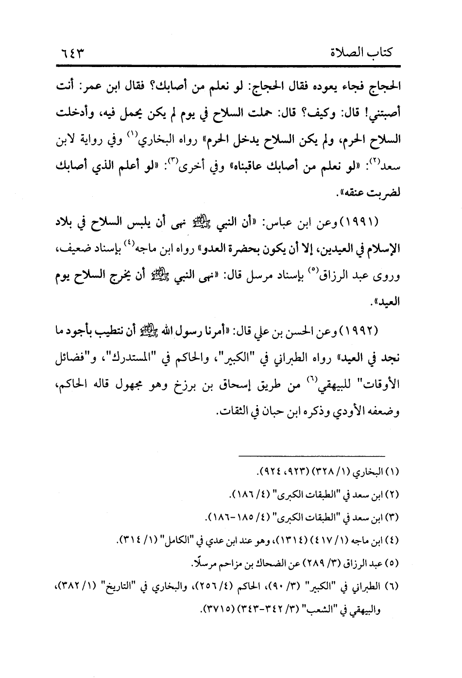 1991 - وعن ابن عباس: «أن النبي - صلى الله عليه وسلم - نهى أن يلبس السلاح في بلاد الإسلام في العيدين، إلا أن يكون بحضرة العدو» رواه ابن ماجه (¬4) بإسناد ضعيف، وروى عبد الرزاق (¬5) بإسناد مرسل قال: «نهى النبي - صلى الله عليه وسلم - أن يخرج السلاح يوم العيد» .