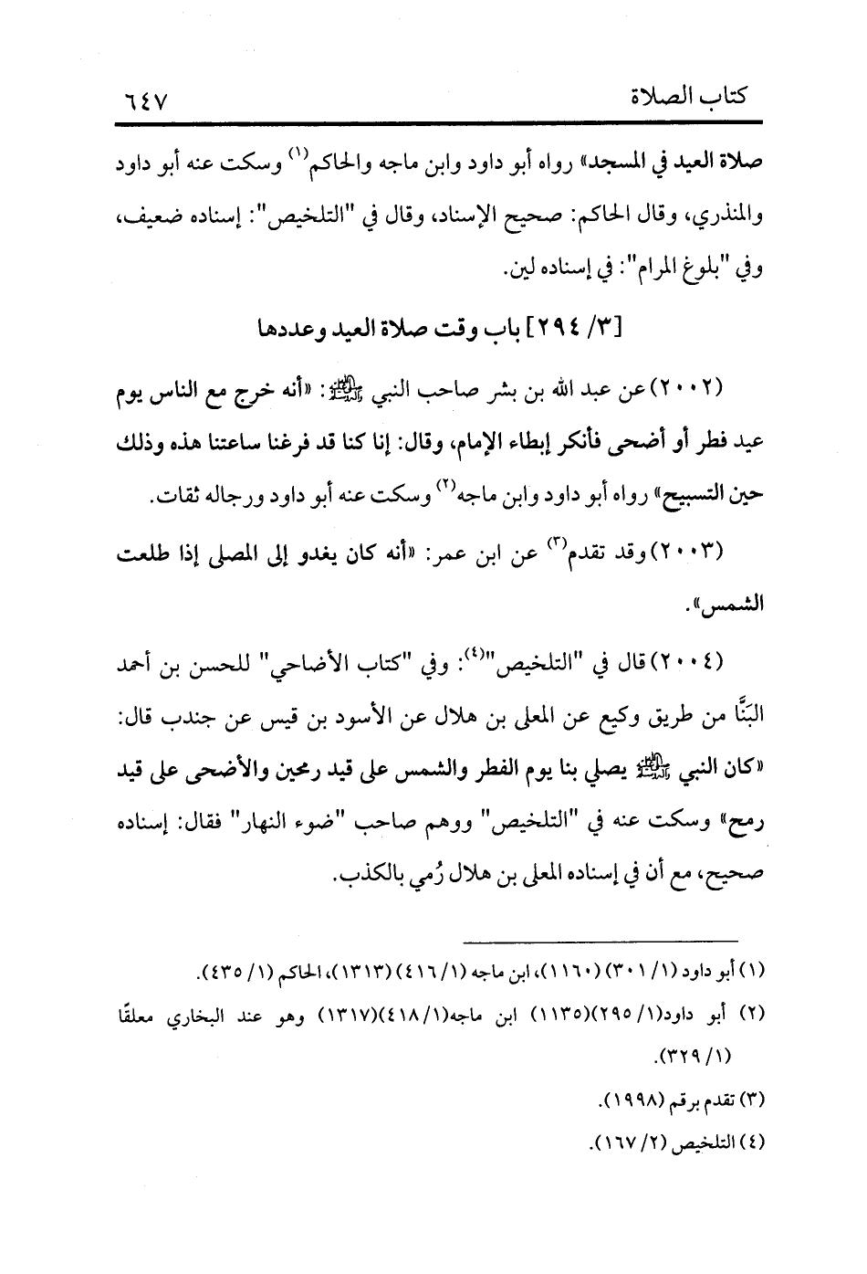 2004 - قال في "التلخيص" (¬4) : وفي "كتاب الأضاحي" للحسن بن أحمد البَنَّا من طريق وكيع عن المعلى بن هلال عن الأسود بن قيس عن جندب قال: «كان النبي - صلى الله عليه وسلم - يصلي بنا يوم الفطر والشمس على قيد رمحين والأضحى على قيد رمح» وسكت عنه في "التلخيص" ووهم صاحب "ضوء النهار" فقال: إسناده صحيح، مع أن في إسناده المعلى بن هلال رُمي بالكذب.