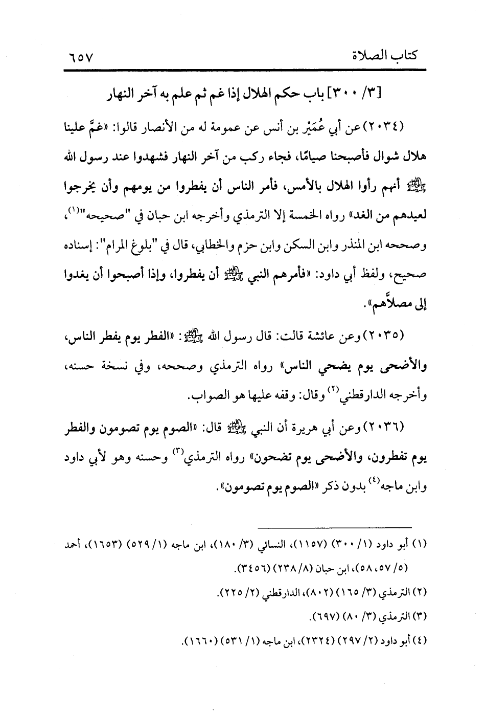2034 - عن أبي عُمَيْر بن أنس عن عمومة له من الأنصار قالوا: «غمَّ علينا هلال شوال فأصبحنا صيامًا، فجاء ركب من آخر النهار فشهدوا عند رسول الله - صلى الله عليه وسلم - أنهم رأوا الهلال بالأمس، فأمر الناس أن يفطروا من يومهم وأن يخرجوا لعيدهم من الغد» رواه الخمسة إلا الترمذي وأخرجه ابن حبان في "صحيحه" (¬1) ، وصححه ابن المنذر وابن السكن وابن حزم والخطابي، قال في "بلوغ المرام": إسناده صحيح، ولفظ أبي داود: «فأمرهم النبي - صلى الله عليه وسلم - أن يفطروا، وإذا أصبحوا أن يغدوا إلى مصلاَّهم» .