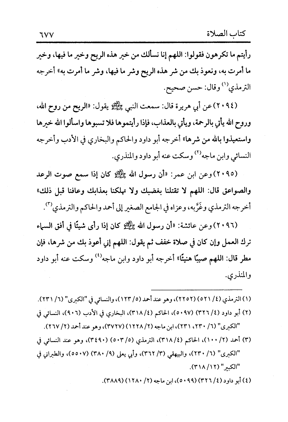 2094 - عن أبي هريرة قال: سمعت النبي - صلى الله عليه وسلم - يقول: «الريح من روح الله، وروح الله يأتي بالرحمة، ويأتي بالعذاب، فإذا رأيتموها فلا تسبوها واسألوا الله خيرها واستعيذوا بالله من شرها» أخرجه أبو داود والحاكم والبخاري في الأدب وأخرجه النسائي وابن ماجه (¬2) وسكت عنه أبو داود والمنذري.