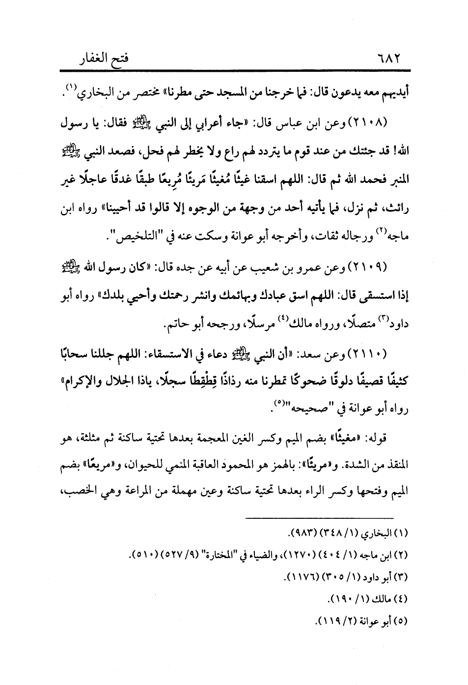 2110 - وعن سعد: «أن النبي - صلى الله عليه وسلم - دعاء في الاستسقاء: اللهم جللنا سحابًا كثيفًا قصيفًا دلوقًا ضحوكًا تمطرنا منه رذاذًا قططًا سجلًا، ياذا الجلال والإكرام» رواه أبو عوانة في "صحيحه" (¬5) .