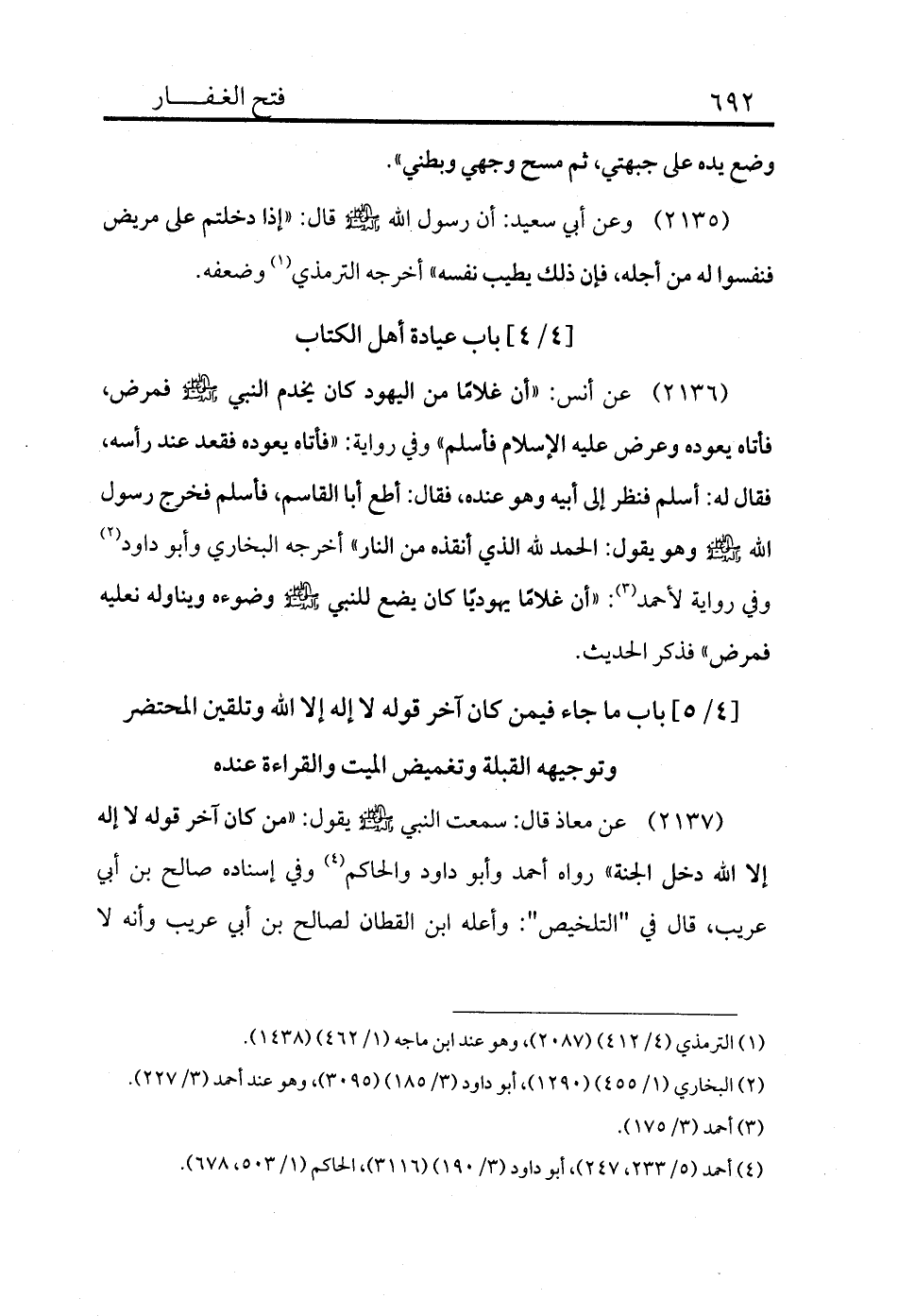 2136 - عن أنس: «أن غلامًا من اليهود كان يخدم النبي - صلى الله عليه وسلم - فمرض، فأتاه يعوده وعرض عليه الإسلام فأسلم» وفي رواية: «فأتاه يعوده فقعد عند رأسه، فقال له: أسلم فنظر إلى أبيه وهو عنده، فقال: أطع أبا القاسم، فأسلم فخرج رسول الله - صلى الله عليه وسلم - وهو يقول: الحمد لله الذي أنقذه من النار» أخرجه البخاري وأبو داود (¬2) وفي رواية لأحمد (¬3) : «أن غلامًا يهوديًا كان يضع للنبي - صلى الله عليه وسلم - وضوءه ويناوله نعليه فمرض» فذكر الحديث.