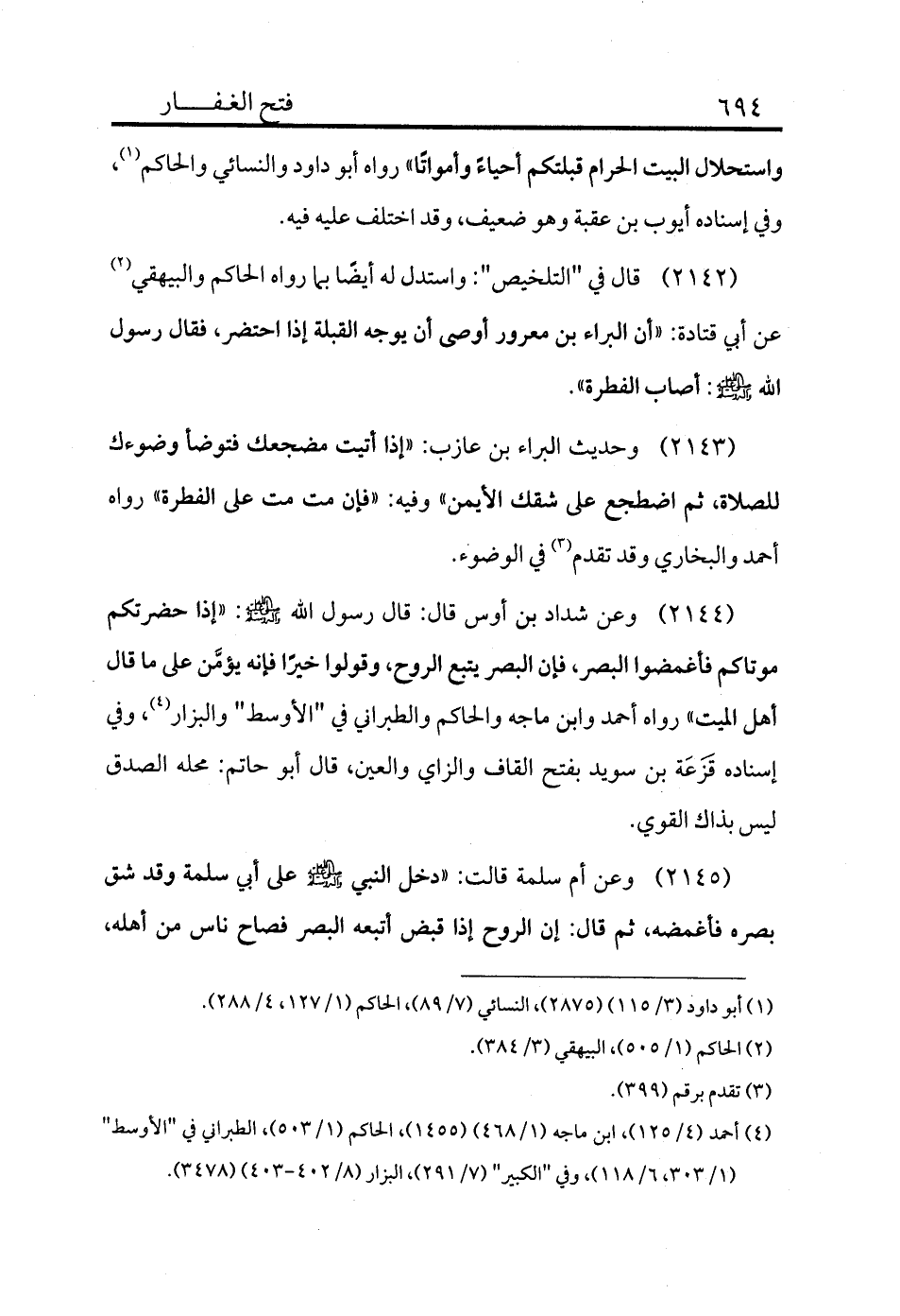 2143 - وحديث البراء بن عازب: «إذا أتيت مضجعك فتوضأ وضوءك للصلاة، ثم اضطجع على شقك الأيمن» وفيه: «فإن مت مت على الفطرة» رواه أحمد والبخاري وقد تقدم (¬3) في الوضوء.