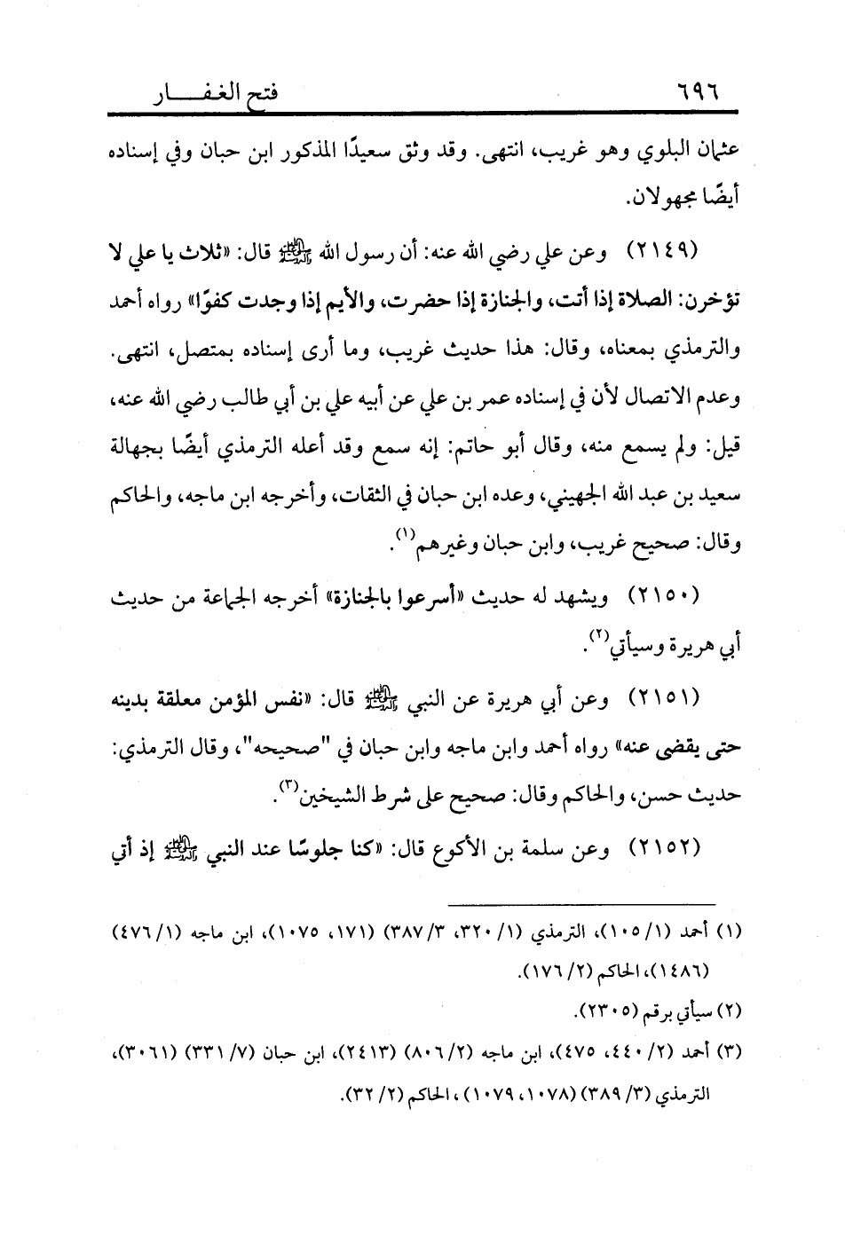 2149 - وعن علي رضي الله عنه: أن رسول الله - صلى الله عليه وسلم - قال: «ثلاث يا علي لا تؤخرن: الصلاة إذا أتت، والجنازة إذا حضرت، والأيم إذا وجدت كفوًا» رواه أحمد والترمذي بمعناه، وقال: هذا حديث غريب، وما أرى إسناده بمتصل، انتهى. وعدم الاتصال لأن في إسناده عمر بن علي عن أبيه علي بن أبي طالب رضي الله عنه، قيل: ولم يسمع منه، وقال أبو حاتم: إنه سمع وقد أعله الترمذي أيضًا بجهالة سعيد بن عبد الله الجهيني، وعده ابن حبان في الثقات، وأخرجه ابن ماجه، والحاكم وقال: صحيح غريب، وابن حبان وغيرهم (¬1) .