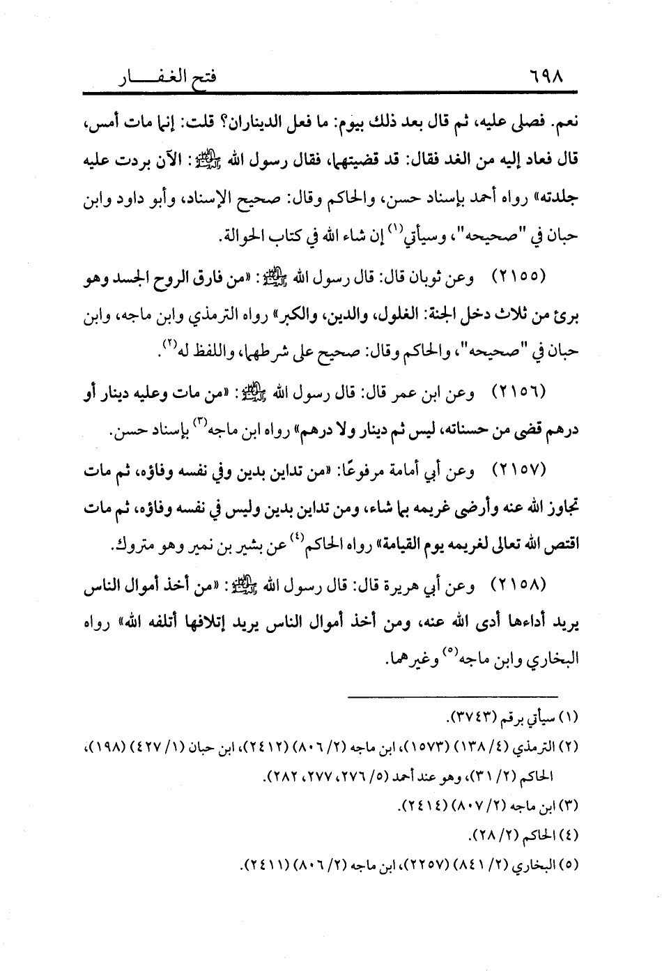 2156 - وعن ابن عمر قال: قال رسول الله - صلى الله عليه وسلم -: «من مات وعليه دينار أو درهم قضى من حسناته ليس ثم دينار ولا درهم» رواه ابن ماجه (¬3) بإسناد حسن.