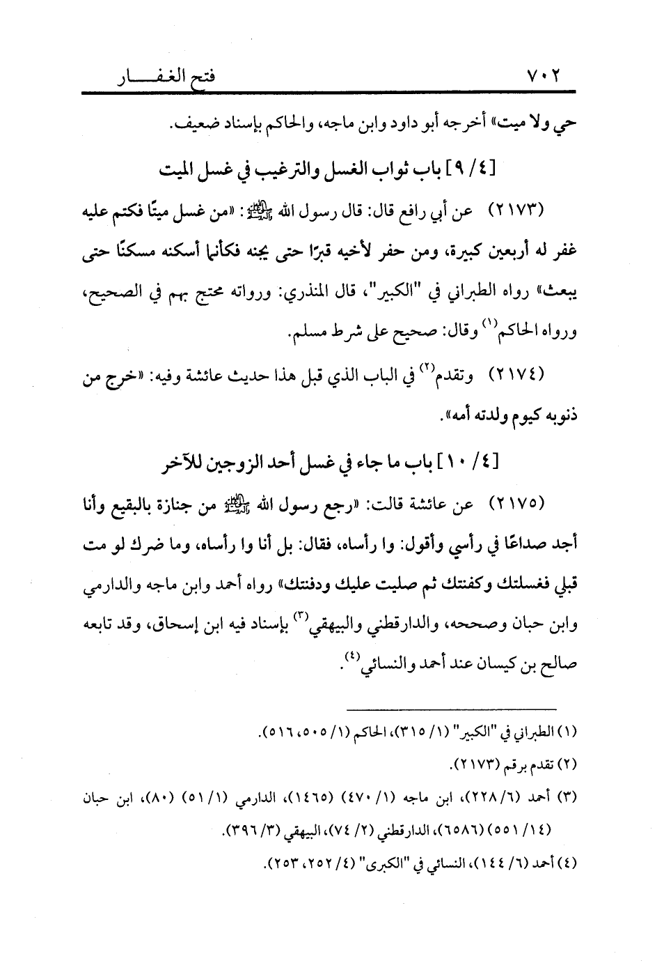 2173 - عن أبي رافع قال: قال رسول الله - صلى الله عليه وسلم -: «من غسل ميتًا فكتم عليه غفر له أربعين كبيرة، ومن حفر لأخيه قبرًا حتى يجنه فكأنما أسكنه مسكنًا حتى يبعث» رواه الطبراني في "الكبير"، قال المنذري: ورواته محتج بهم في الصحيح، ورواه الحاكم (¬1) وقال: صحيح على شرط مسلم.