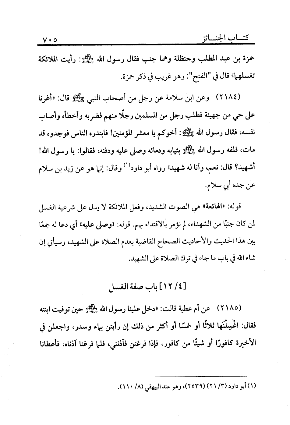 حمزة بن عبد المطلب وحنظلة وهما جنب فقال رسول الله - صلى الله عليه وسلم -: رأيت الملائكة تغسلهما» قال في "الفتح": وهو غريب في ذكر حمزة.