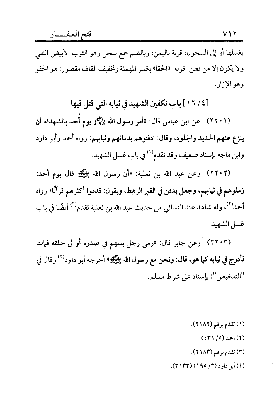 2203 - وعن جابر قال: «رمى رجل بسهم في صدره أو في حلقه فمات فأدرج في ثيابه كما هو، قال: ونحن مع رسول الله - صلى الله عليه وسلم -» أخرجه أبو داود (¬4) وقال في "التلخيص": بإسناد على شرط مسلم.